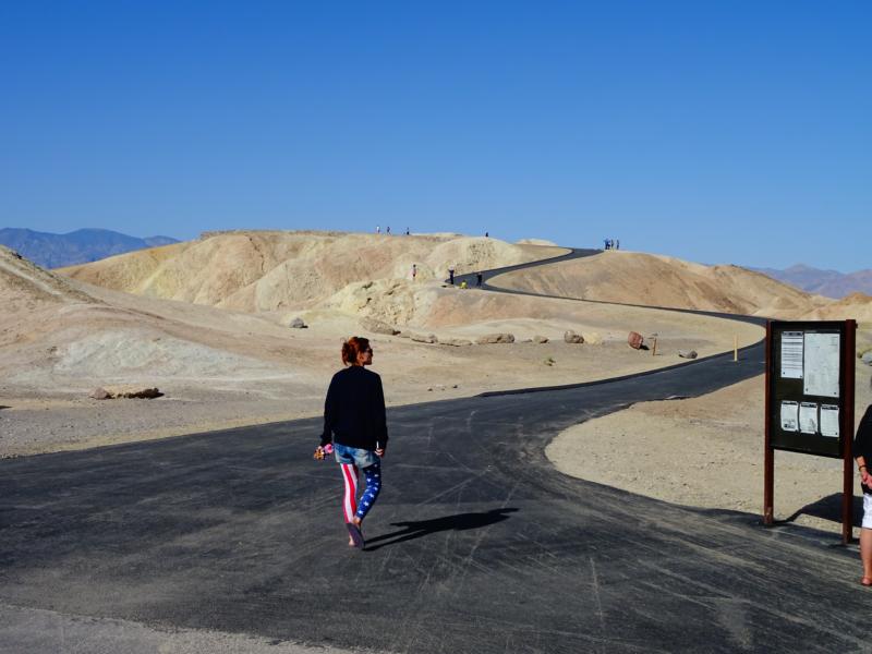 5h... ohhhh... die Nacht war kurz. Trotzdem sind wir fit und freuen uns auf die Weiterfahrt. Endlich weg von hier! Um 5.40h holt der Bell-Man unser Gepäck. Das Auschecken geht sehr flott und um 6h machen wir uns auf den Weg. Da so wenig los ist, halten wir gleich noch am Sign und knipsen unsre Erinnerungsbilder und dann, nichts wie weg von hier! Der Tag wird sehr lang, das Navi zeigt über 10Std. an. Um kurz vor acht erreichen wir unsren höchsten und auch kältesten Punkt für heute... Dantes View. 1641M bei 42°F und extrem windig. Wir halten es nur 5 Min. draußen aus, knipsen ein paar Bilder und fahren gleich weiter. Am Zabriskie Point ist es gleich viel schöner und wärmer. Herrliche 25°C und leichter Wind. Hier können wir ein bisschen länger bleiben und ausgiebig Fotos machen. Gegen Mittag erreichen wir Devil´s Golf Course. Sieht das cool aus hier – HAMMER!