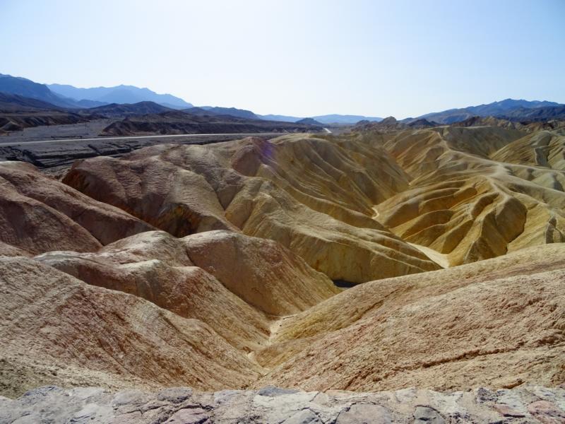 5h... ohhhh... die Nacht war kurz. Trotzdem sind wir fit und freuen uns auf die Weiterfahrt. Endlich weg von hier! Um 5.40h holt der Bell-Man unser Gepäck. Das Auschecken geht sehr flott und um 6h machen wir uns auf den Weg. Da so wenig los ist, halten wir gleich noch am Sign und knipsen unsre Erinnerungsbilder und dann, nichts wie weg von hier! Der Tag wird sehr lang, das Navi zeigt über 10Std. an. Um kurz vor acht erreichen wir unsren höchsten und auch kältesten Punkt für heute... Dantes View. 1641M bei 42°F und extrem windig. Wir halten es nur 5 Min. draußen aus, knipsen ein paar Bilder und fahren gleich weiter. Am Zabriskie Point ist es gleich viel schöner und wärmer. Herrliche 25°C und leichter Wind. Hier können wir ein bisschen länger bleiben und ausgiebig Fotos machen. Gegen Mittag erreichen wir Devil´s Golf Course. Sieht das cool aus hier – HAMMER! :super: Aber Achtung!!!