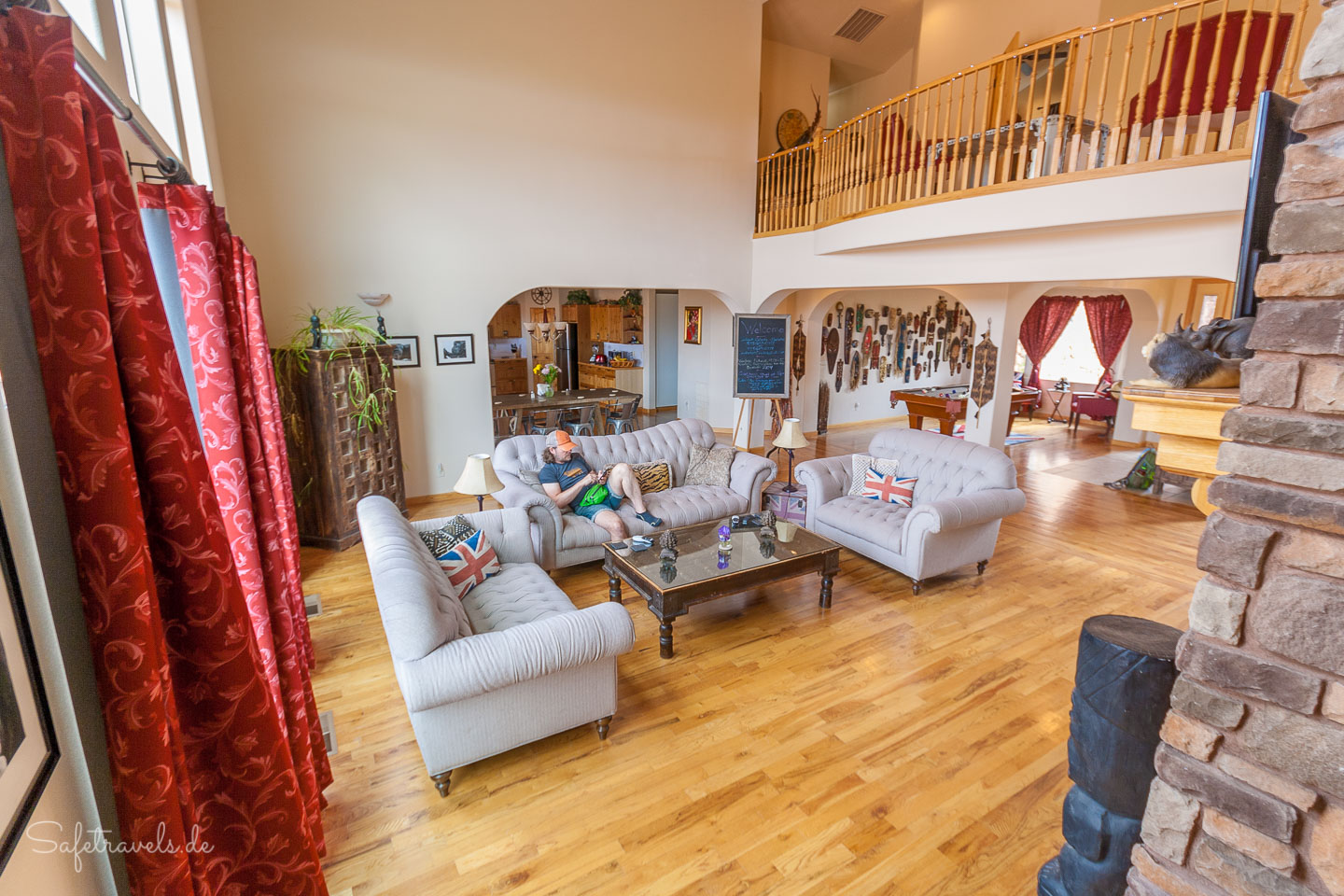 Celeste und Nicholas bewohnen ein wunderbar gelegenes riesiges Haus in Kanab und vermieten mehrere Zimmer. Wir hatten das größte Zimmer im Erdgeschoss gemietet, es erstreckt sich über den gesamten linken Flügel. Man hat Blick auf die Wüste und das Gehege mit den Eseln. Es gibt ein schönes Bad mit einer großen Dusche und einem Whirlpool. Wohnzimmer, Küche und der Rest des Erdgeschosses stehen allen Gästen zur Verfügung. Wer ganz allein sein will, ist hier nicht gut aufgehoben. Beim Frühstück trafen wir immer andere Gäste und haben uns super unterhalten. Der Billardtisch stand im Wohnzimmer direkt neben unserer Zimmertür. Es wurde abends so bis 22 oder 23 Uhr Billard gespielt, somit war es etwas lauter. Hat uns jetzt nicht gestört. WLAN kostenlos. Celeste ist eine wunderbare Gastgeberin und hat sich sehr um alle Gäste gekümmert.