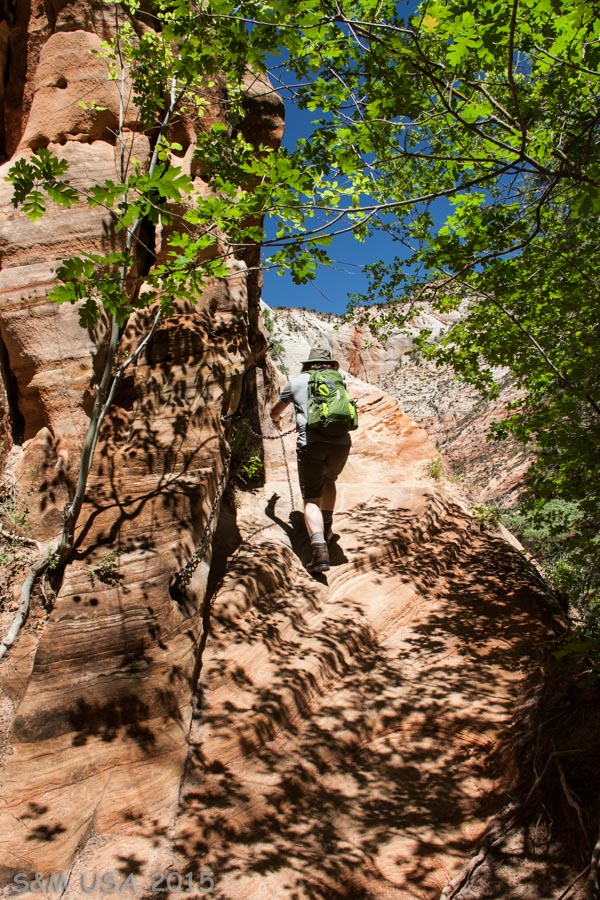 Wir fahren die wunderschöne Strecke zum Osteingang des Parks und stehen dort erstmal in der Schlange. Die Fahrt auf dem Highway 9 durch den Ostteil des Parks ist wieder atemberaubend schön und wir sehen zum allerersten Mal Bighorn Sheep. Zum Glück ergattern wir am Visitor Center noch einen Parkplatz und fahren dann mit dem Shuttle zum Weeping Rock Trailhead. Der Trail ist anfangs derselbe wie zum Observation Point. Er windet sich zunächst in asphaltierten Serpentinen die Wand hinauf. Bald erreicht man den Abzweig zum Hidden Canyon und die Switchbacks werden enger und steiler. Der Aufstieg ist nicht unanstrengend, dafür bieten sich wunderschöne Aussichten auf den Canyon und auf Angels Landing auf der gegenüberliegenden Seite. Schließlich erreicht man die spannendste Stelle. Hier wurde der Trail aus der blanken Felswand geschlagen und man geht auf einem exponierten Vorsprung. Teilweise gibt es Ketten zur Sicherung. Trotz Höhenangst überwinde ich mich und wir gehen den Rest des Trails bis zum Anfang des Hidden Canyon. Hier ist für mich der Weg zu Ende und ich warte auf Markus, der zusammen mit einem Schweizer den Hidden Canyon erforscht. Ich sitze entspannt auf einem Felsen und beobachte die Leute. Nach einer guten Stunde ist er wieder zurück und wir machen uns auf den Rückweg. Insgesamt ein wunderschöner und empfehlenswerter Trail, der zum Glück nicht so überlaufen ist, wie der Trail bis Angels Landing. Auf der Fahrt zurück Richtung Kanab haben wir Glück und sehen noch ein Bighorn Sheep. Und zudem ergattern wir einen Parkplatz gleich hinter dem Tunnel, so daß wir heute den Canyon Overlook Trail gehen können. Dieser kurze und schöne Trail belohnt am Ende mit einer grandiosen Aussicht über die sich ins Tal windenden Serpentinen des Highway 9 nach dem Tunnel.