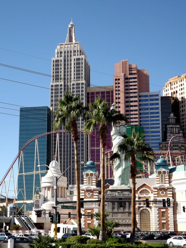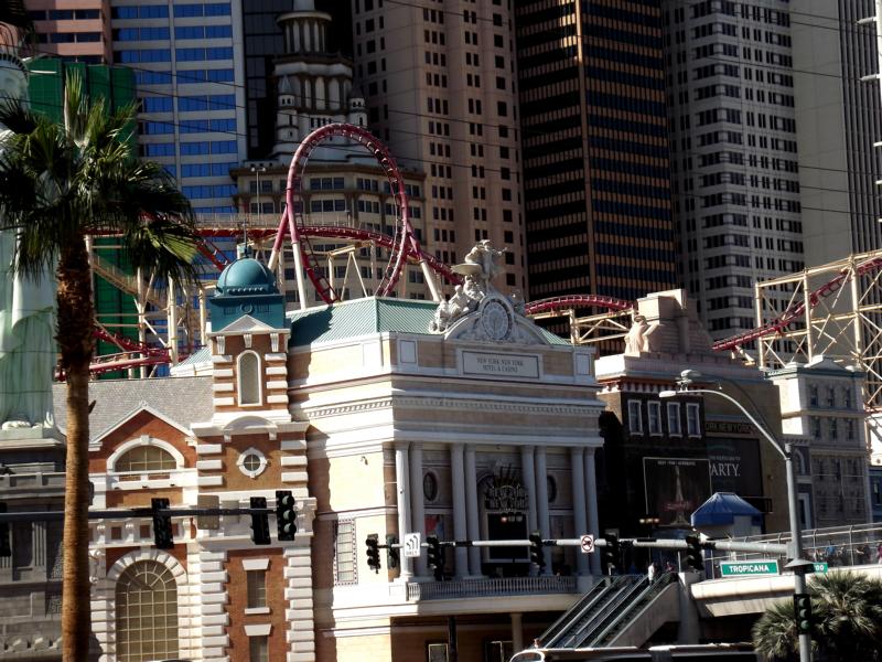 Bei dem letzten Bericht vom Las Vegas Strip habe ich ein wichtiges Hotel bewusst ausgelassen und zwar das riesige New York New York Hotel & Casino, das bereits 1997 eröffnet wurde. Bei dem großen Komplex wurde unter anderem die Freiheitsstatue, das Empire State Building und das Chrysler Building nachgebaut. Zusammen mit dem imposanten Togo Looping Coaster “Manhattan Express” (der eigentlich seit 2006 nur noch Rolller Coaster heißt, aber von niemandem so genannt wird), der ebenfalls 1997 eröffnet wurde, bildet das Hotel eine beeindruckende Skyline. So viel zum Thema kein Coasterfreier Tag :D Die Fahrt haben wir am Abend gemacht, bevor wir zur Fremont Street gefahren sind.