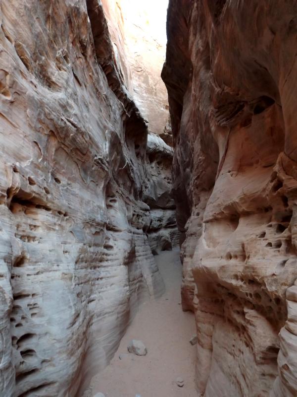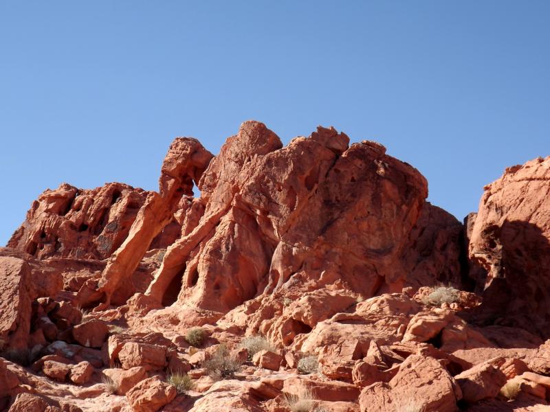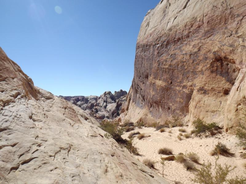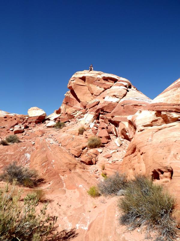 Der Hinweis, dass es unterwegs kein Wasser gibt, ist durchaus angebracht, denn im Sommer werden im Valley of Fire Temperaturen bis zu 50 Grad Celsius erreicht. Die hatten wir im Oktober nicht mehr, aber jenseits der 30 waren es schon noch und viel Schatten gibt es auch nicht. Ich habe als erstes mal meine Schuhe ausgezogen und bin den Trail barfuß gelaufen. Sollte man nicht tun, weiß ich, aber ich mach das unheimlich gerne, vor allem, wenn der Weg fast nur aus Sand besteht. Meine Füße sind dementsprechend abgehärtet und wo meine Begleitung schon anfing zu schreien merkte ich nichtmal ein kitzeln. Na gut... einen blutigen dicken Zeh hatte ich am Ende, aber ein bisschen Schwund ist ja immer :D