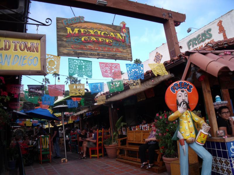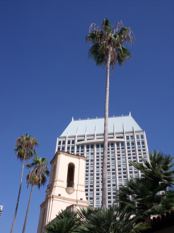 Nach den 4 Stunden auf der Midway ist das Wetter ein Traum und die Temperaturen sind bis 28°C angestiegen. Wir beschließen das Auto auf dem bezahlten Parkplatz stehen zu lassen und zu Fuß zum Gaslamp Quarter zu gehen, weil ich noch ein Shirt kaufen möchte. Es ist zwar in dem Fall "nur" ein Hard Rock Hotel und kein Café, aber das macht ja nichts - einen Rockshop gibt es trotzdem.