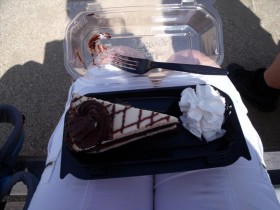 Ahhh. Durst. Wasser hab ich noch im Rucksack. Das hilft aber nur mir weiter, weil Dominik muss auf Toilette und bei ihm gilt: Wenn man auf Toilette muss, dann KANN man nichts trinken. Geht nicht. Weil es läuft ja sofort durch in die Blase und dann muss man noch mehr! Gut... dann eben nicht. Warm ist es halt, kann man nicht ändern (man könnte sich ja eincremen...) ICH mag es ja... :D. Gegen die schmerzenden Füße laufen wir nicht zurück zum Auto, sondern fahren die zwei Haltestellen mit dem Trolly, kostet ja nicht viel und die Haltestelle ist direkt vor dem Hard Rock Cafe. Das hilft natürlich nicht lange, aber immerhin können wir uns die Strecke sparen. Und Hunger? Direkt dort wo wir aussteigen ist eine Cheesecake Factory, aber zum essen gehen ist es uns noch zu früh, also tun wir etwas, das Dominik schon ewig mal tun wollte: KEIN Steak hier essen, sondern tatsächlich einen Kuchen. Es ist so rappelvoll, dass wir ewig auf einen Tisch warten müssen, also bestellen wir den Kuchen zum mitnehmen und setzen uns draußen etwas entfernt auf eine Bank.