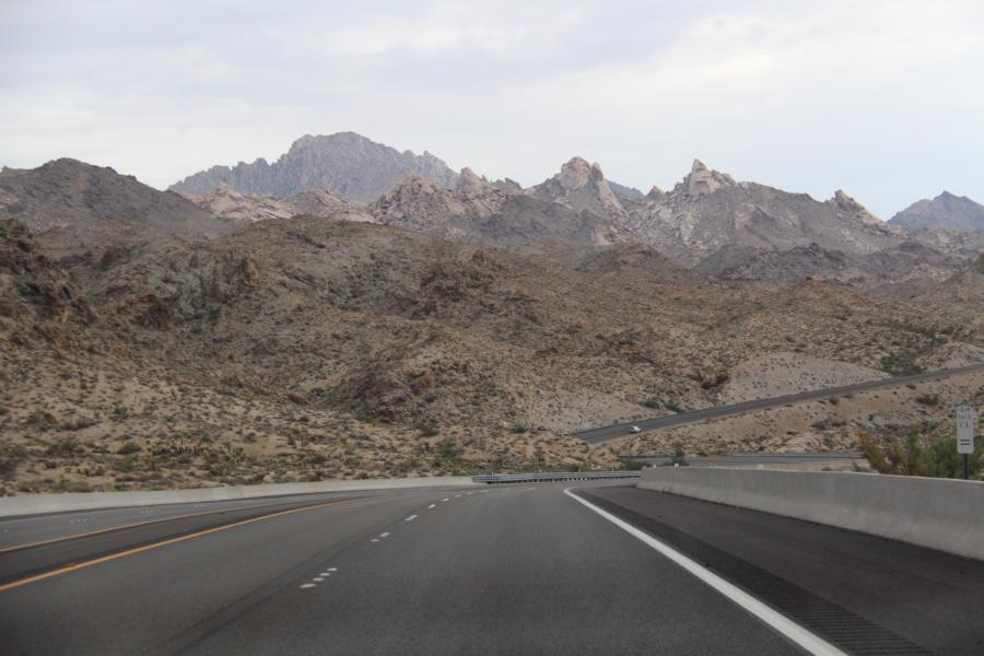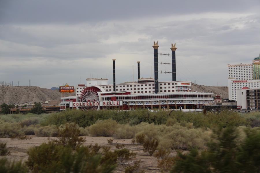 Wir fahren durch Bullhead City und können im Hintergrund einige Blicke auf Laughlin werfen. Hier hätten wir eigentlich übernachtet und bei den meisten Berichten die ich gelesen hatte, kam der Ort alles andere als gut weg. Von der Straße aus sieht er aber eigentlich ganz nett aus... Zumindest die Colorado Belle sieht richtig cool aus. Kurz danach verlassen wir Nevada auch wieder und erreichen Arizona!