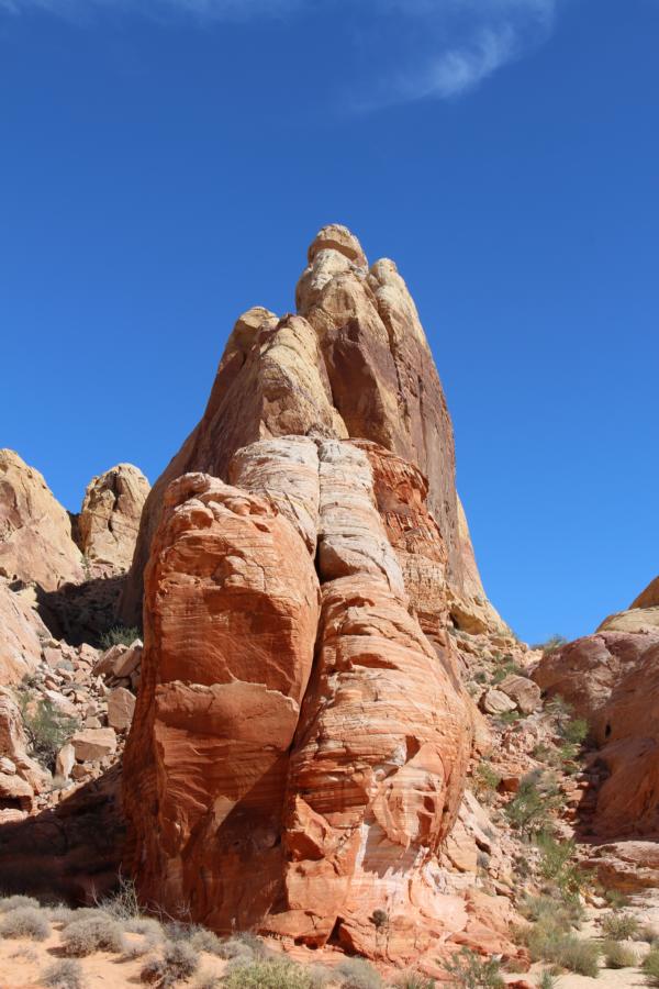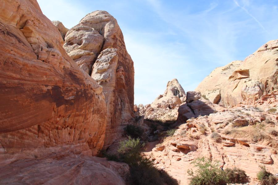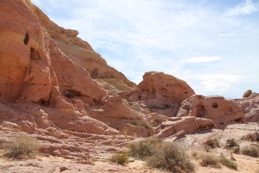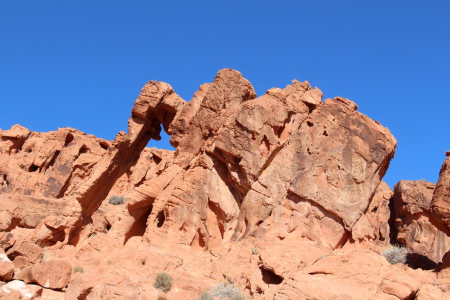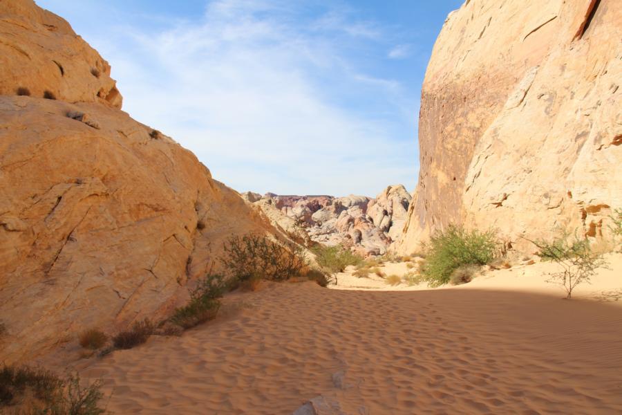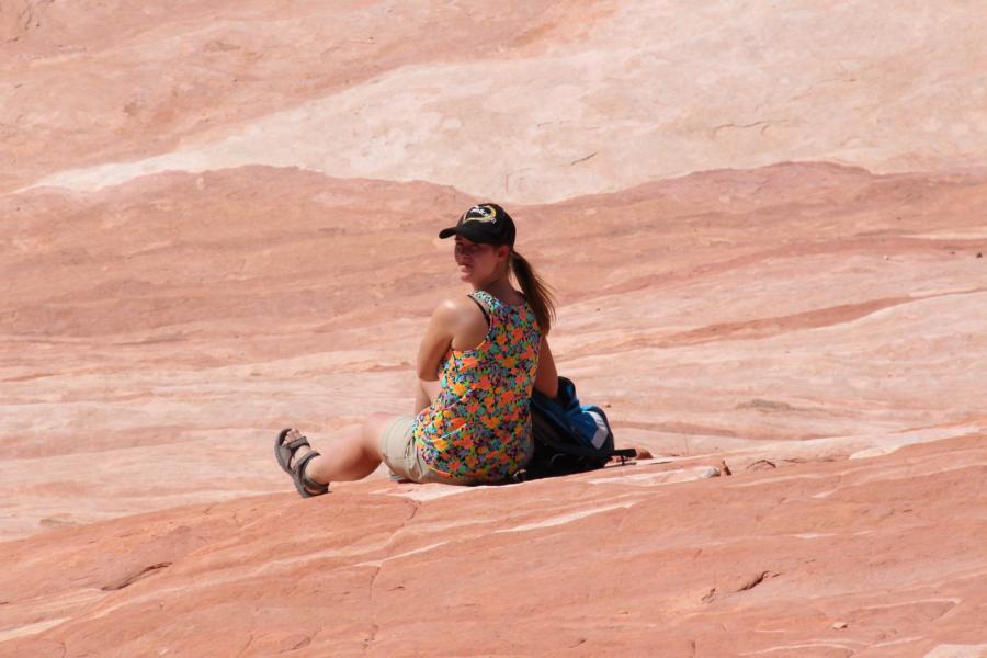 Wir bleiben direkt auf dem Parkplatz stehen, wo wir bezahlt haben und reiben uns dick mit Sonnencreme ein. Es ist schon wirklich unfassbar heiß, obwohl nicht einmal 9 Uhr ist. Das Valley of Fire ist im Sommer wirklich ... muckelig warm. Wir packen ein bisschen Wasser ein, obwohl wir nur ca. 15 Minuten unterwegs sein werden und machen uns auf den kurzen Weg querfeldein zum Elephant Rock.
