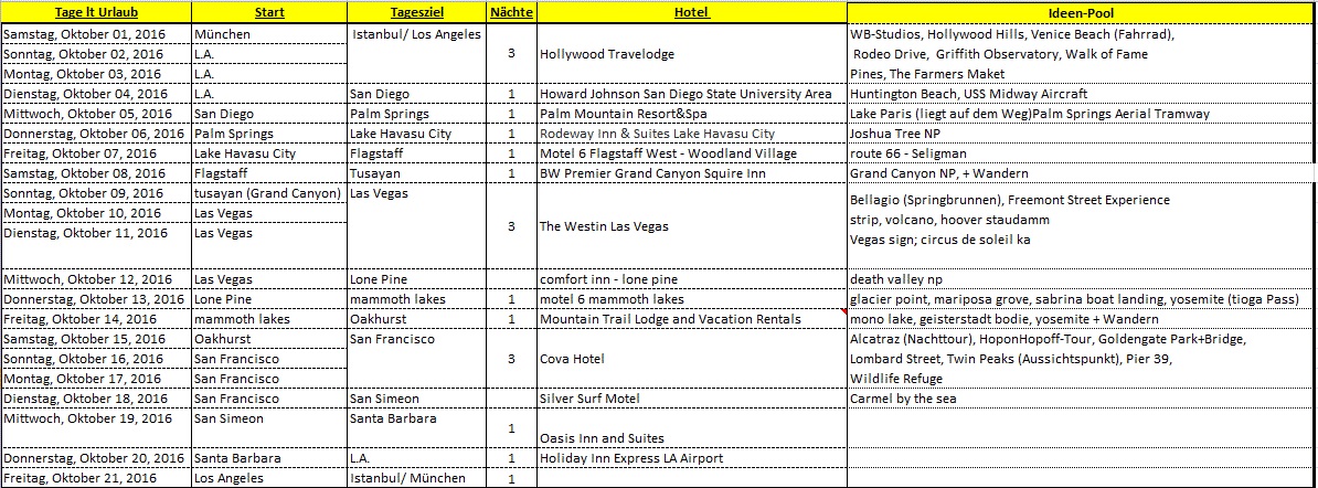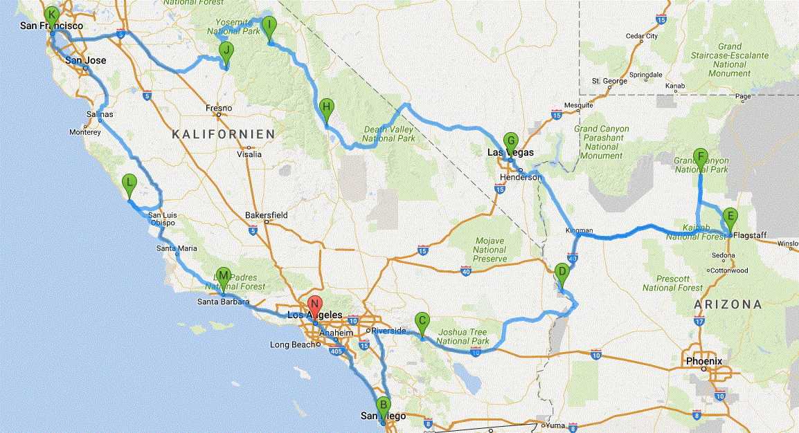 L.A. (3 Nächte) =>San Diego => Palm Springs => Needles, Havasu Lake(2 Nächte) => Tusayan (Grand Canyon) => Las Vegas (3 Nächte) => Yosemite (2 Nächte) => Fresno => San Francisco (3 Nächte) => Santa Maria =>Santa Barbara => L.A (Abflug Tag)