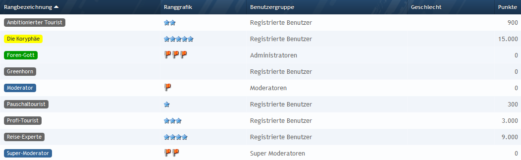 Hello Fans, gibt es für Neulinge, oder Greenhorns, wie Ihr sie nennt, eine Art Beschreibung der Abkürzungen und Bezeichnungen? Ab wann wird man z.B. "Gott", was sind abonnierte Themen, was bedeutet der blaue Punkt, was ist der Unterschied zwischen Koryphäe und Profi-Tourist?