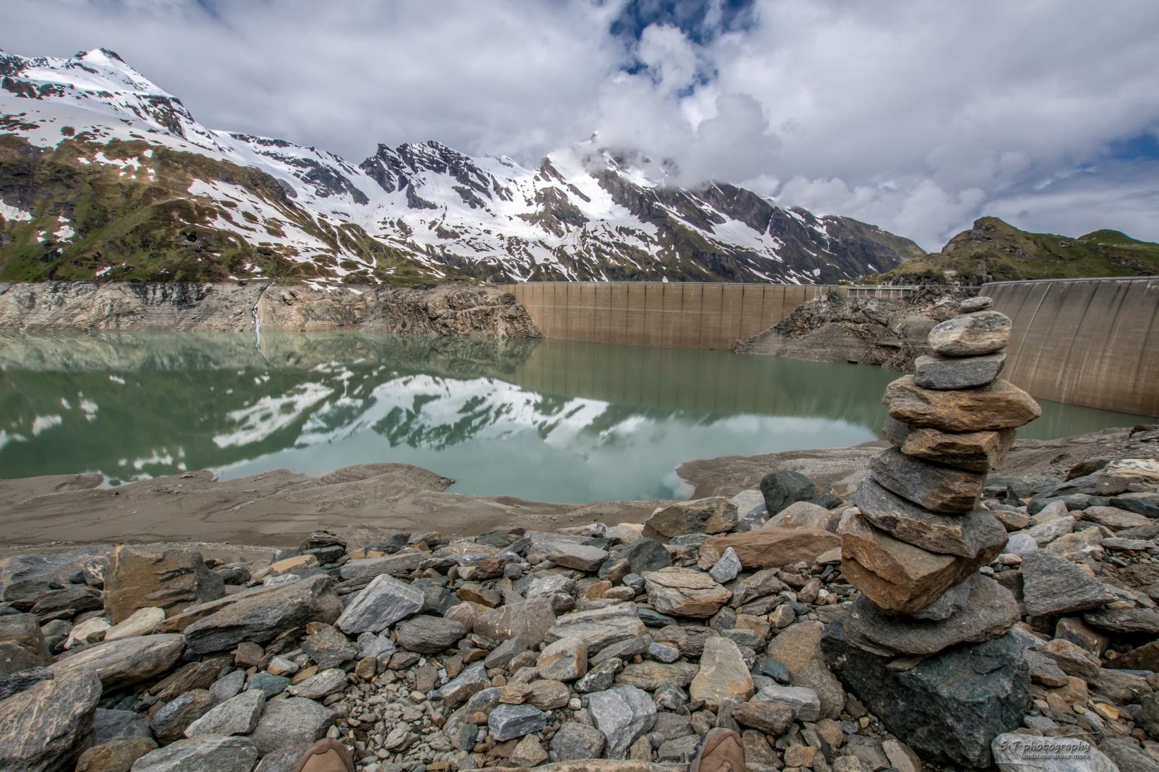 Schnell hängen wir die Gruppe ab, die sich eh für eine Staumauerführung anstellen. Wir laufen über die Staumauer und genießen den Blick auf die Berge.