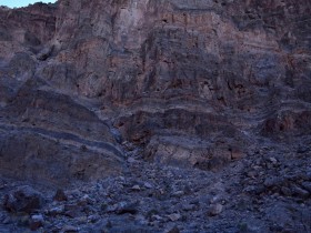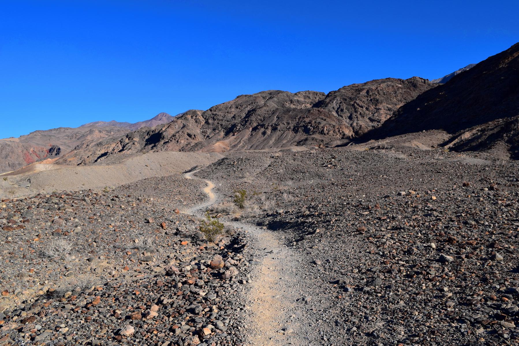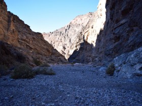 Auch wenn der Fall Canyon wieder etwas vollkommen anderes ist als der Mosaic Canyon, der Desolation Canyon oder der Golden Canyon... Eins haben die Canyons vom Death Valley ALLE gemeinsam: Sie gehen konstant bergauf. Nicht sehr steil, aber eben bergauf. Beim Fall Canyon kommt erschwerend hinzu, dass man ununterbrochen auf losem Kiesel und Schotter läuft, der teilweise so tief ist, dass man ständig den halben Schuh darin versenkt. Das macht das Laufen hier irgendwie etwas nervig und anstrengend.