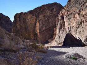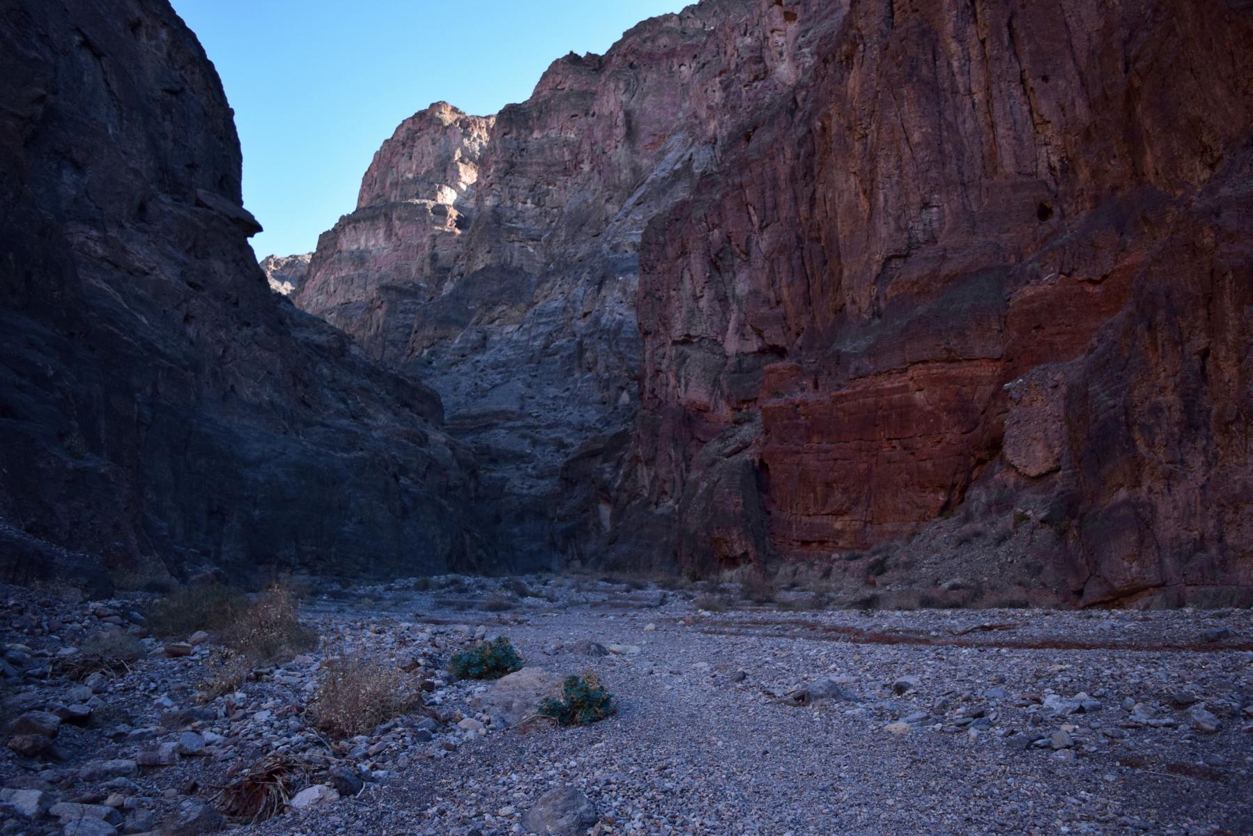 Als dann die Umgebung endlich mal ein wenig nach Canyon aussieht gefällt es mir direkt richtig gut. Es ist ein sehr weiter, offener Canyon und hat absolut nichts mit Slot Canyon zu tun. Dafür sind die Felsen aber sehr imposant, hoch und vor allem: rot. Rote Steine im Death Valley? Ja, gibt es. Im Fall Canyon! Leider sind die Lichtverhältnisse durch die Höhe der Klippen eine absolute Katastrophe um diese Tageszeit und auf den Fotos kann man die intensive Färbung nur erahnen. Später wird es ein wenig besser aussehen.