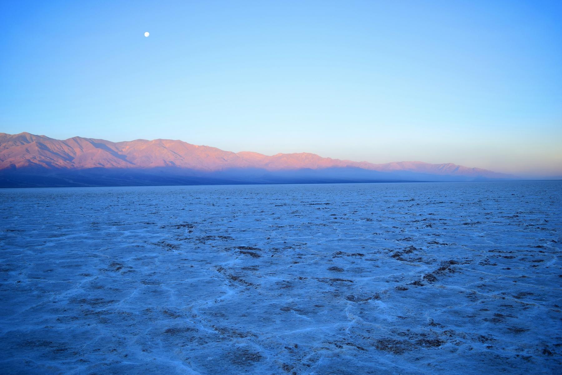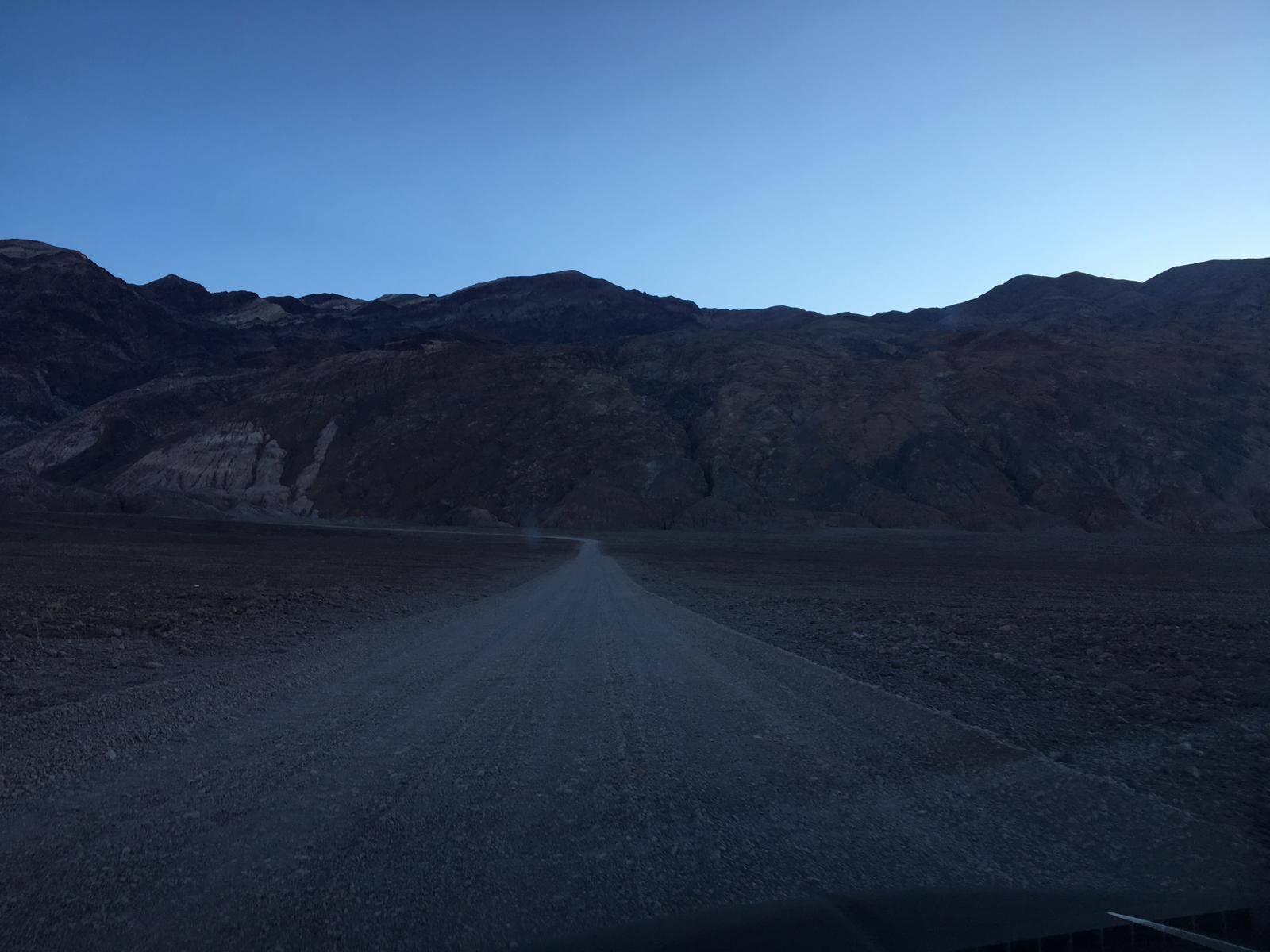Heute werde ich zum ersten Mal seit Ankunft von meinem Handy Wecker aus dem Schlaf gerissen und bin nicht schon vorher wach. Ich habe wieder sehr gut geschlafen und die Temperatur im Auto ist optimal. Es ist 4:45 Uhr und ich muss erst einmal Zähne putzen gehen, heute komme ich nach dem Sonnenaufgang nicht zurück zum Campingplatz. Dafür werfe ich nur schnell die Jacke über und fahre dann wieder mit Schlafklamotten die 100 Meter zum Visitor Center. Ich muss mich mal wieder zuhause melden und gönne mir direkt 24 Stunden Internet anstatt nur eine Stunde. So muss ich morgen früh nicht mehr zahlen und kann heute Abend nochmal reinschauen. So verbringe ich wie gestern die erste Stunde nach dem Aufstehen, ziehe mir dann im warmen Auto die Wanderklamotten an und mache mich um 6 Uhr auf den Weg in Richtung Badwater Basin.