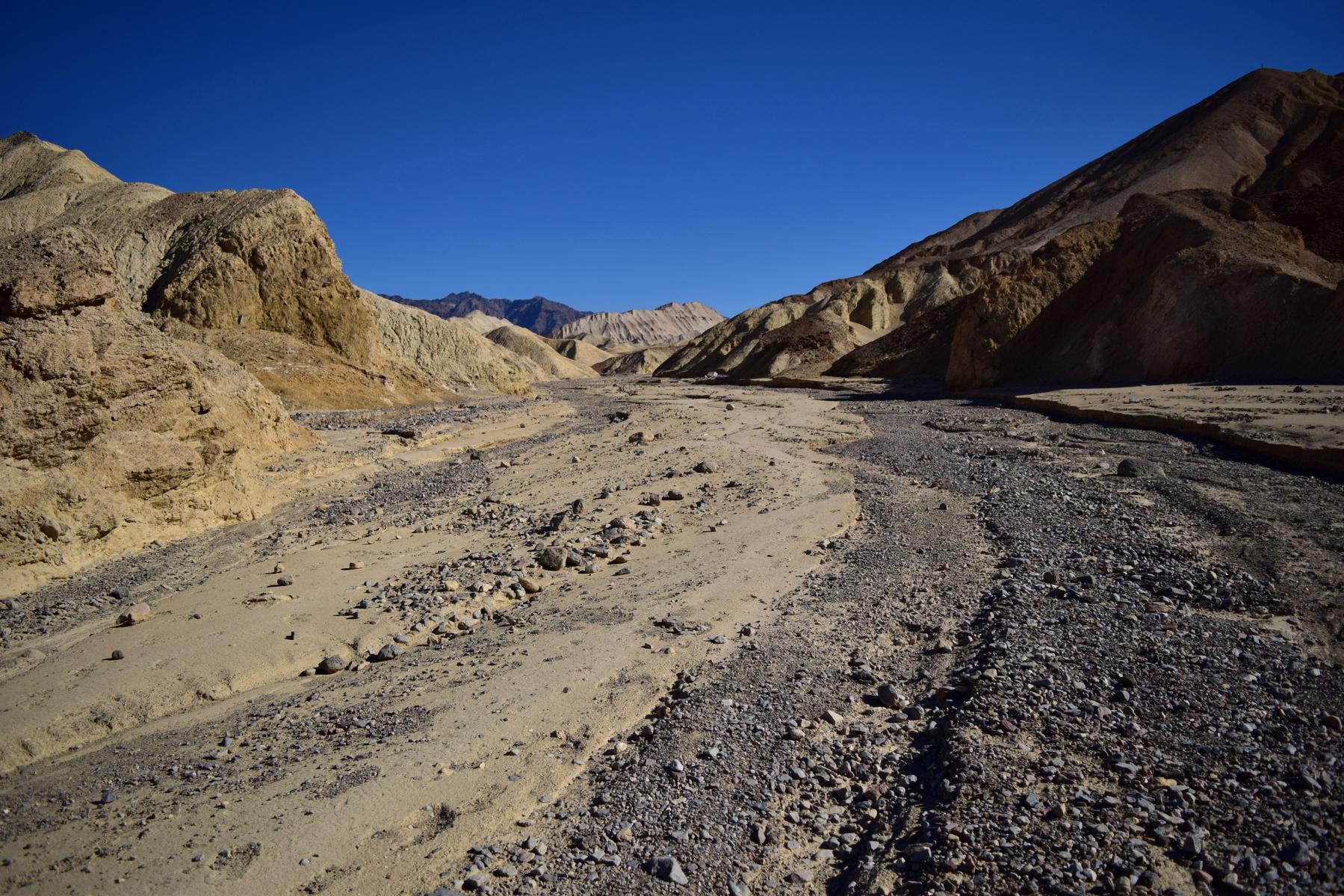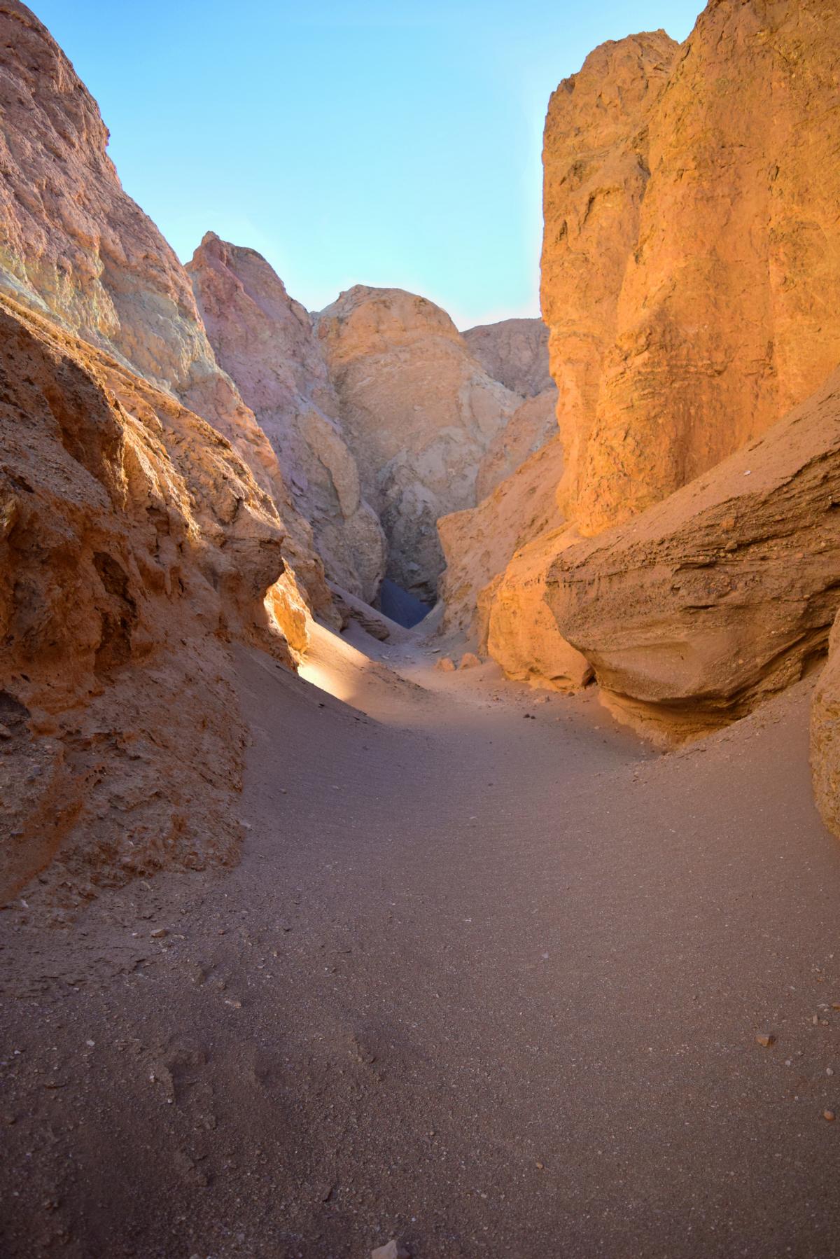 Man kann hier allerdings nicht nur in den Golden Canyon gehen und wieder umdrehen, sondern auch eine große Runde von insgesamt 12,6 km laufen. Dieser Roundtrip besteht insgesamt aus drei verschiedenen Gebieten, die auch alle einzeln erwandert werden können. Von diesem Parkplatz aus erreicht man zwei dieser Trails und zwar den Gower Gulch und den Golden Canyon mit der Red Cathedral. Das dritte Gebiet, die Zabriskie Badlands, haben ihren Trailhead am Parkplatz vom Zabriskie Point. Es dauert noch über fünf Stunden bis die Sonne untergeht und natürlich ist die lange Kombination aus allen drei Teilen geplant und nicht nur der kurze Canyon. Jetzt muss ich mich nur noch für eine Richtung entscheiden… Starte ich geradeaus mit dem Golden Canyon in den Loop oder nach rechts mit dem Gower Gulch? Die Entscheidung fällt – wie der Titel dieses Berichtteils schon verrät – auf letzteren, der Golden Canyon ist mir grad einfach zu voll und nach dem einsamen Desolation Canyon habe ich keine Lust auf viele andere Leute.