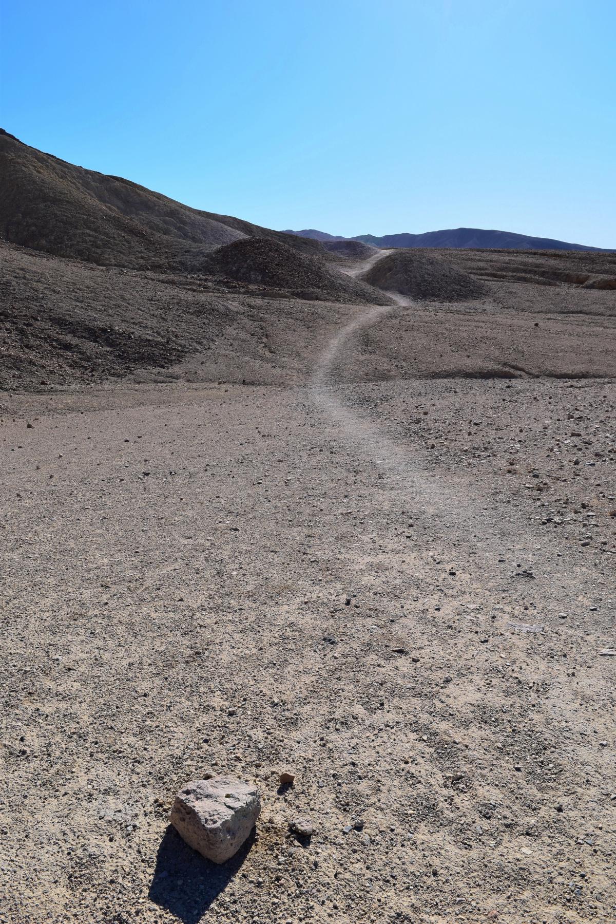 Der Beginn des Gower Gulch Loops führt zunächst durch eine Mondlandschaft an den Bergen vorbei, parallel zur Badwater Road. Ich habe eine Karte vom Loop auf dem Handy, aber leider keine Wegpunkte in meinen Offline Karten. Das wollte ich eigentlich noch erledigt haben, habe ich dann aber in dem Stress vor der Abreise vergessen. Ich hoffe einfach mal auf eine vernünftige Beschilderung des Trails, damit ich zumindest weiß, wann es Zeit wird links in die Berge abzubiegen. Weit vor mir geht ein Pärchen und solange die noch in meinem Sichtfeld sind, werde ich wohl richtig sein.