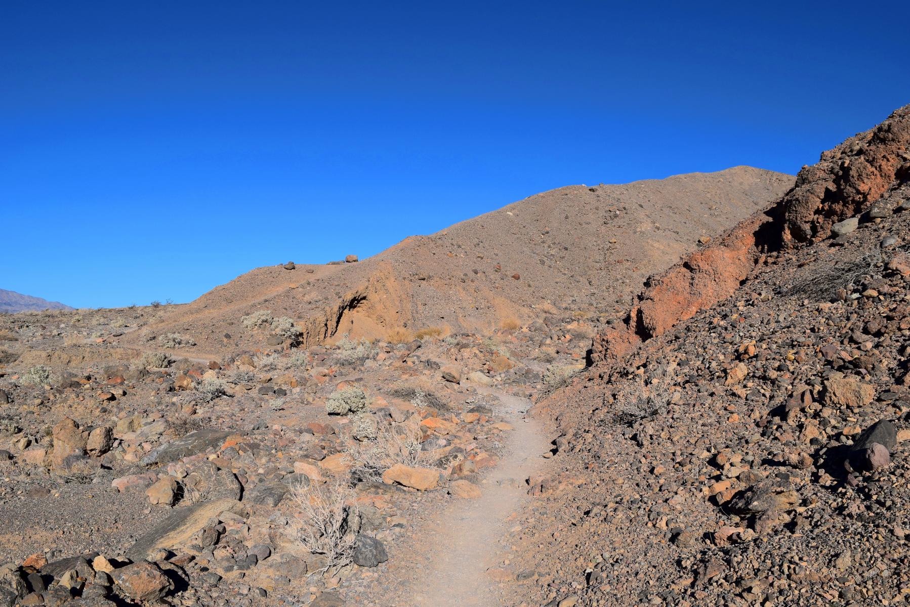 Jetzt folge ich dem Golden Canyon schließlich zurück zum Parkplatz. Der Trail ist die ganze Zeit angenehm und sanft abfallend, aber dafür bin ich ja auch im Vorfeld teilweise gut bergauf gelaufen. Es kommen mir immer mehr Menschen entgehen, auch wenn es auf den Fotos nicht so aussieht... Da habe ich natürlich gewartet, bis keiner mehr im Blickfeld war. Wirklich voll ist es nicht, aber schon deutlich belebter. Mein persönliches Highlight ist eine Gruppe Frauen in Stöckelschuhen, die wissen wollen, ob es genau so uneben weiter geht