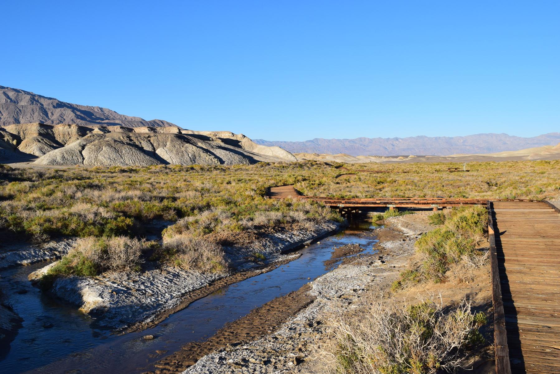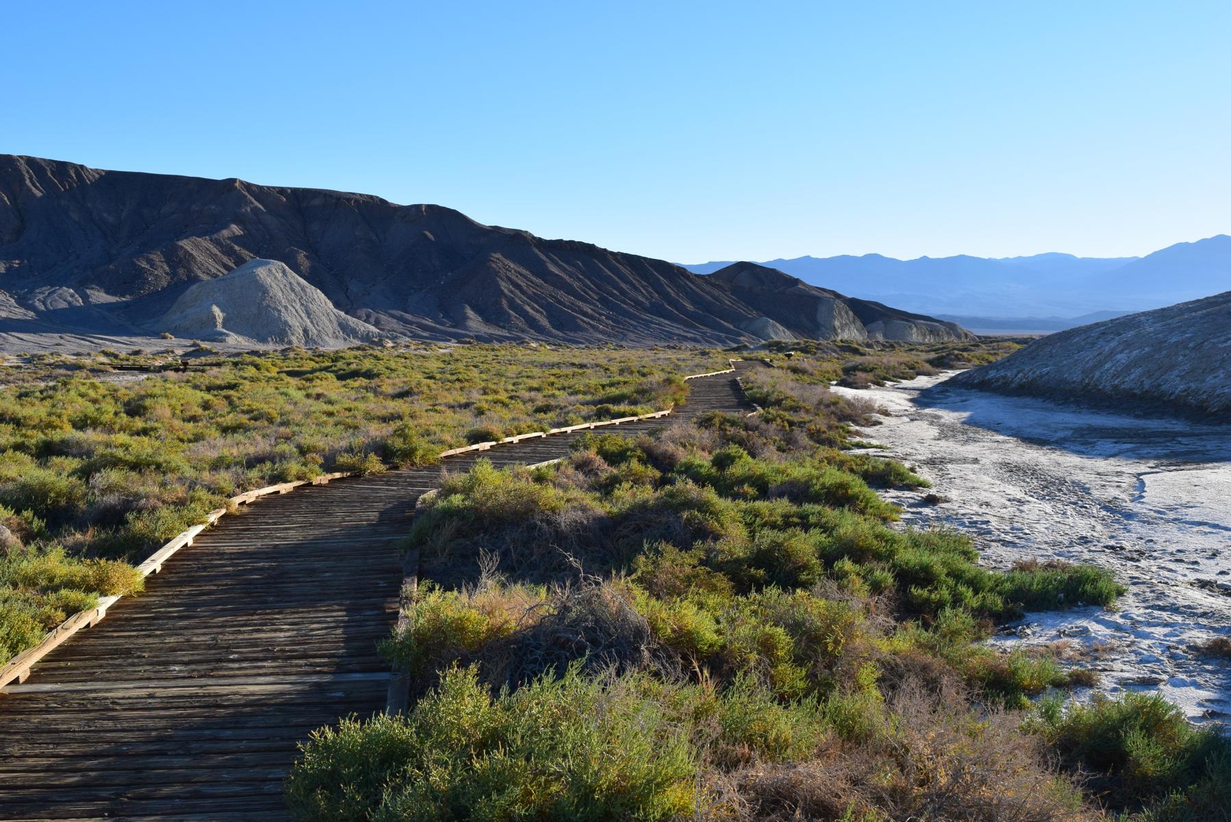 Entlang des Trails gibt es jede Menge Infotafeln, zu allen möglichen Themen. Einige davon handeln über eine Fischart, die nur hier im Death Valley vorkommt und die den unmöglichsten Lebensbedingungen ausgesetzt ist. Diese Fische haben jedes Jahr nur extrem wenig Zeit um sich fortzupflanzen, da das Wasser im Sommer nahezu verschwindet und nur noch winzige, extrem heiße Tümpel zurücklässt. Ich beobachte den Salt Creek an einigen Stellen sehr lange, aber leider kann ich heute keine Fische hier entdecken, sehr schade. Aber das passt ja zu den bisherigen Tiersichtungen… Es gibt nämlich keine.
