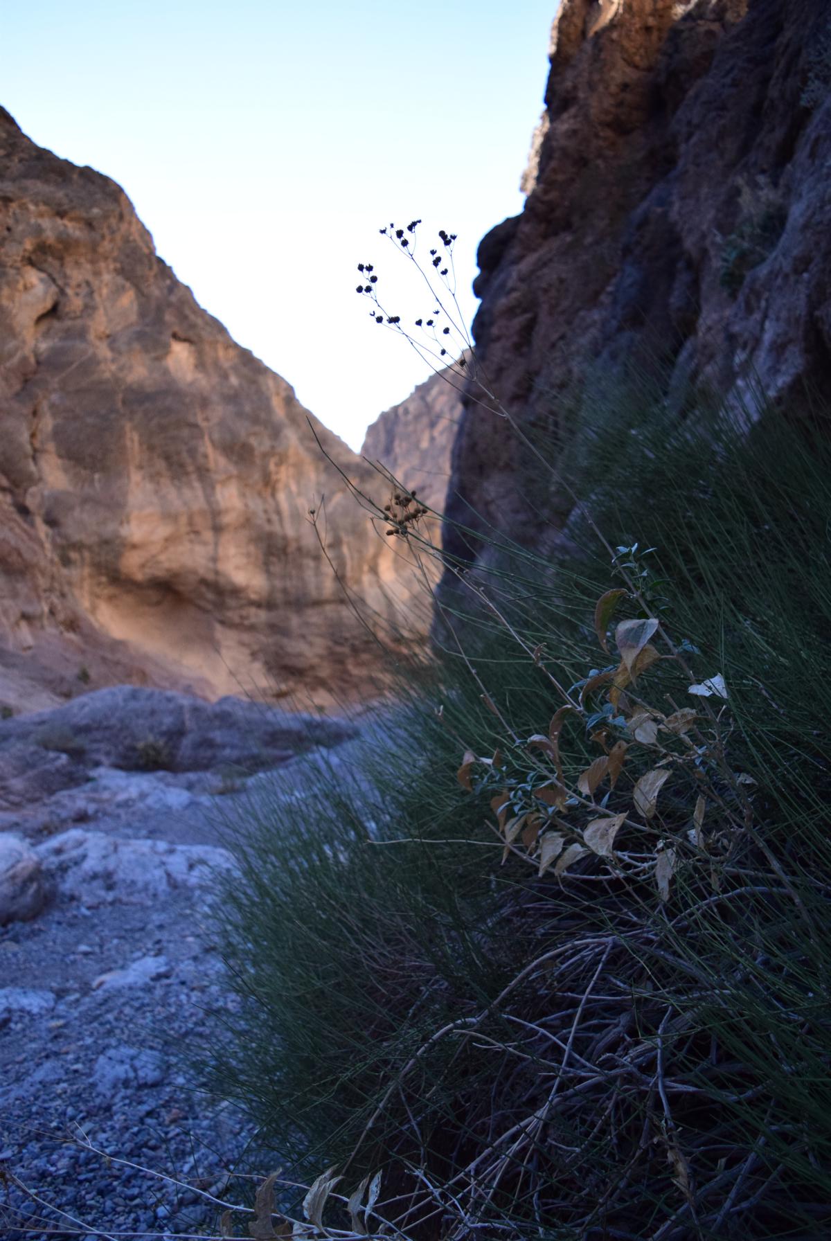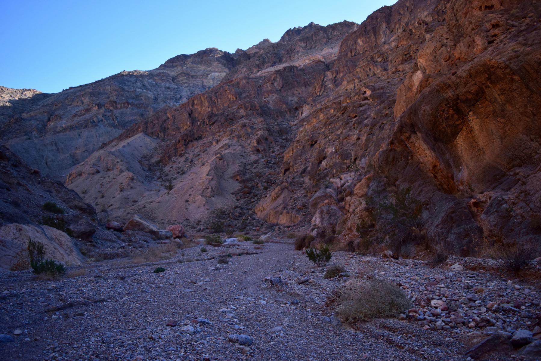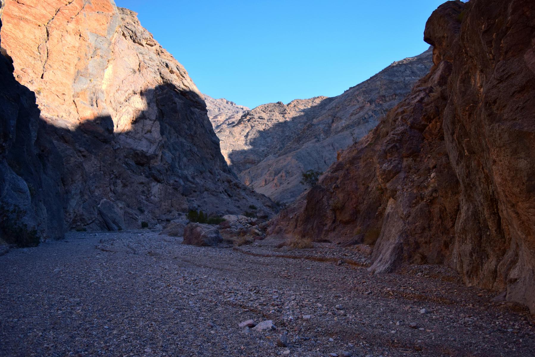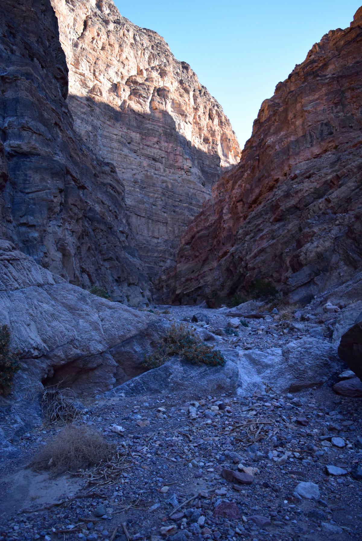 Als dann die Umgebung endlich mal ein wenig nach Canyon aussieht gefällt es mir direkt richtig gut. Es ist ein sehr weiter, offener Canyon und hat absolut nichts mit Slot Canyon zu tun. Dafür sind die Felsen aber sehr imposant, hoch und vor allem: rot. Rote Steine im Death Valley? Ja, gibt es. Im Fall Canyon! Leider sind die Lichtverhältnisse durch die Höhe der Klippen eine absolute Katastrophe um diese Tageszeit und auf den Fotos kann man die intensive Färbung nur erahnen. Später wird es ein wenig besser aussehen.