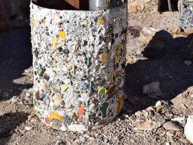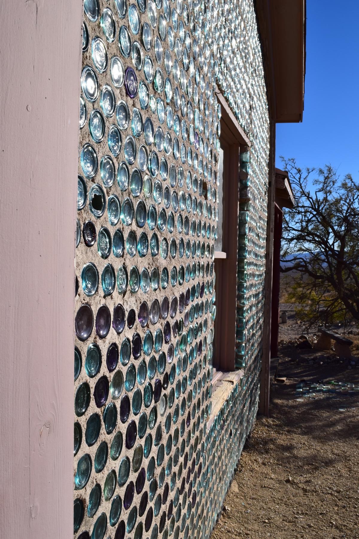 Es gibt mehr als nur einen Parkplatz für Rhyolite, da die übrig gebliebenen Gebäude ein bisschen verstreut sind. Ich halte mich zuerst an die Ausschilderung für das berühmte Bottle House, einem Haus, das komplett aus leeren Glasflaschen gebaut ist. Beim Aussteigen friere ich direkt und zieh mir den Pullover über, die paar Höhenmeter mehr merkt man hier sehr gut und außerdem weht ein sehr frischer Wind.