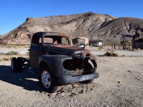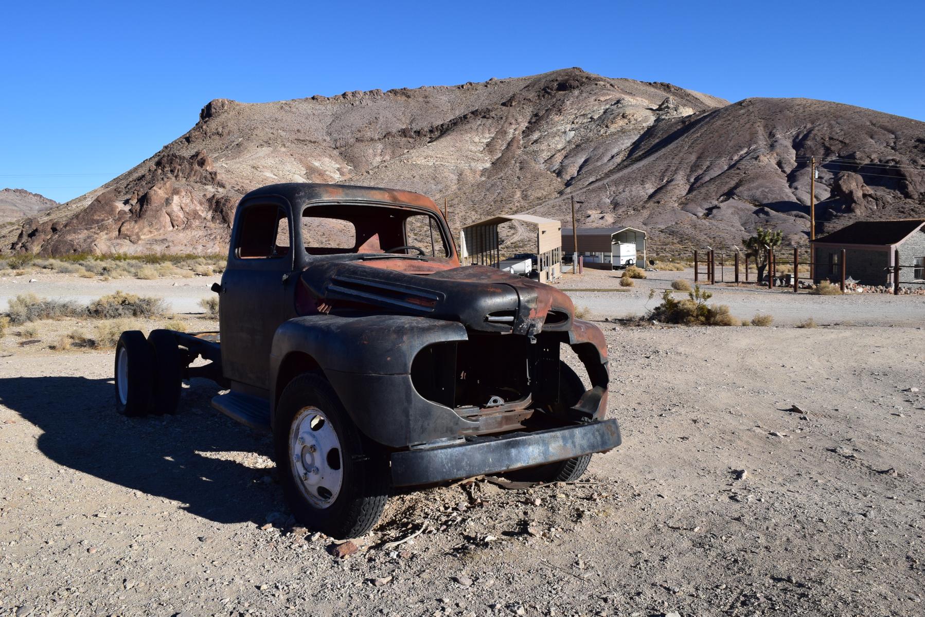Viel ist hier nicht los, an dem Parkplatz hier steht nur ein weiteres Auto. Die Besitzer wollen sich jetzt am Bottle House umsehen, also räume ich das Feld und laufe hier noch ein bisschen durch die Gegend. Rostige Autos dürfen bei einer Ghost Town natürlich nicht fehlen.