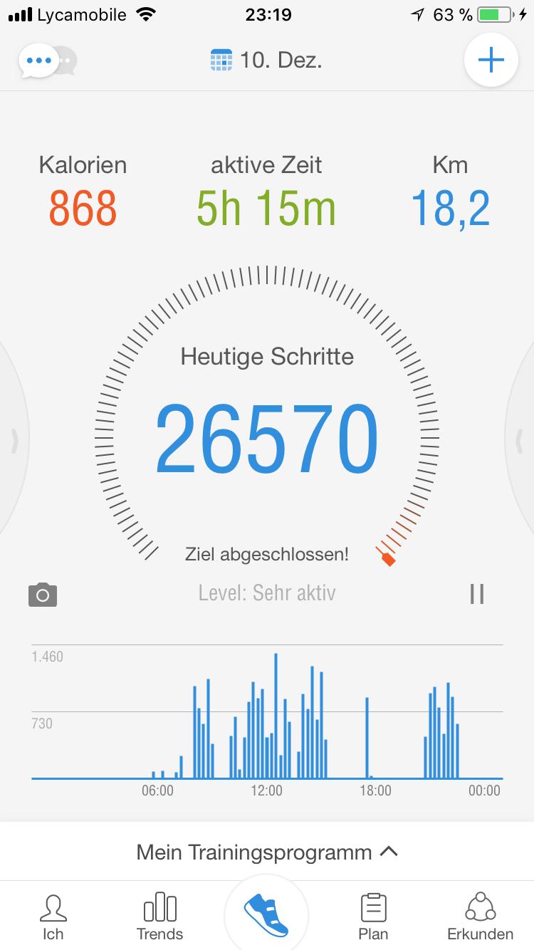 Auch die Schritt- und Kilometerzahl von diesem Tag kann sich sehen lassen. Trotz der kurzen Trails ist doch schon wieder einiges zusammen gekommen.