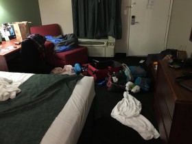 Zurück in Barstow parke ich direkt vor der Rezeption des Super 8 Motels und lasse mir meine Karte geben. Ich soll um das Gebäude herum fahren und mein Zimmer ist dann oben. Alles klar... Ich fahre also um das Gebäude und parke dort, wo es von den Zimmernummern her hin kommt, wuchte meinen Koffer die Außentreppe hoch... und stelle dann fest, dass ich am falschen Gebäudetrakt bin, die Nummerierung ziemlich komisch ist und das ich bis ganz hinten durch hätte fahren müssen... Waaah. Also Koffer wieder runter, zurück in's Auto, zum richtigen Gebäude und alles wieder hoch.
