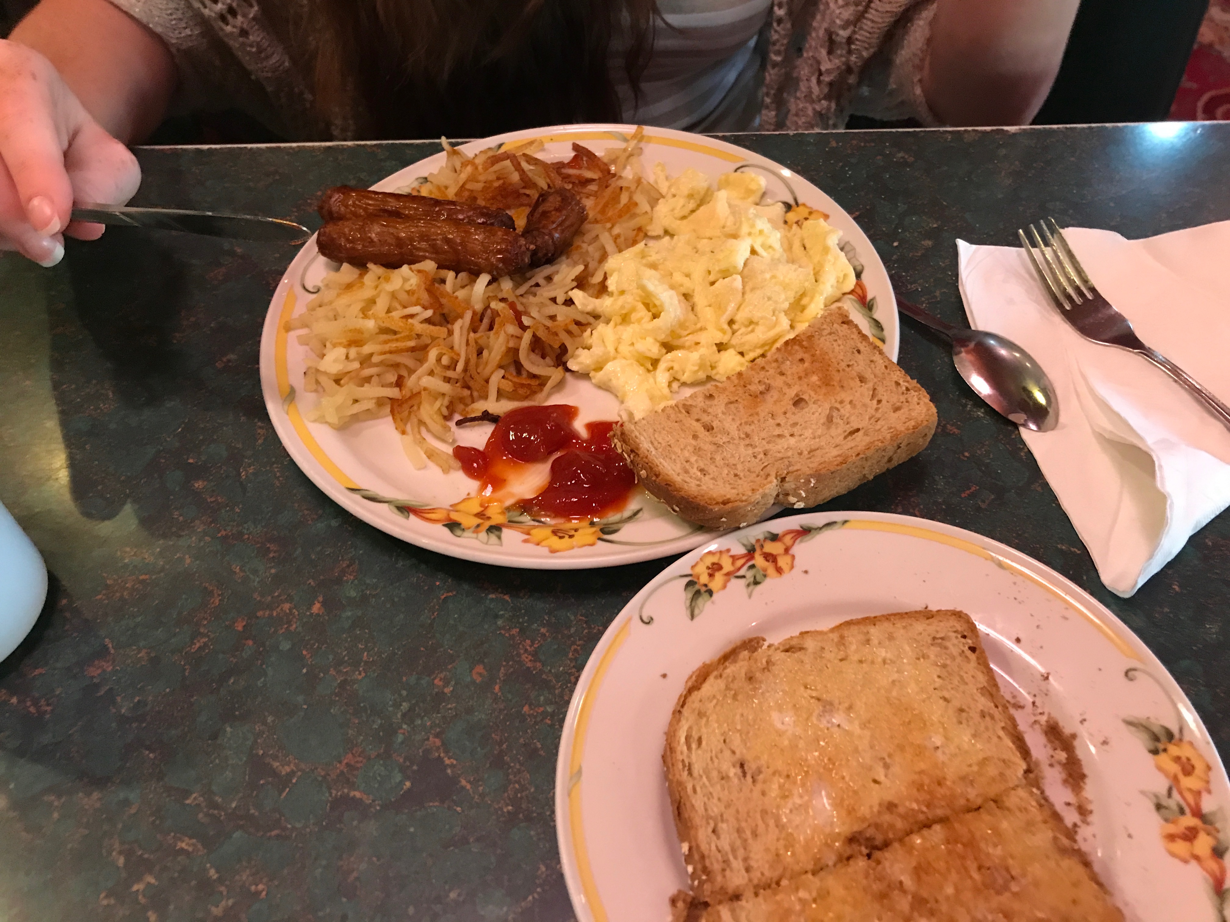 Emma und ich bestellen jeder ein Omelette mit Hash Browns, Salat und Avocado. Marsl nimmt einen Cheeseburger – es wird nicht der einzige im Urlaub bleiben. Das Essen ist richtig gut, aber eines hatten wir bei unseren Omelettes übersehen. Dahinter stand klein in Klammern: Spicy. Hätte man auch größer schreiben können
