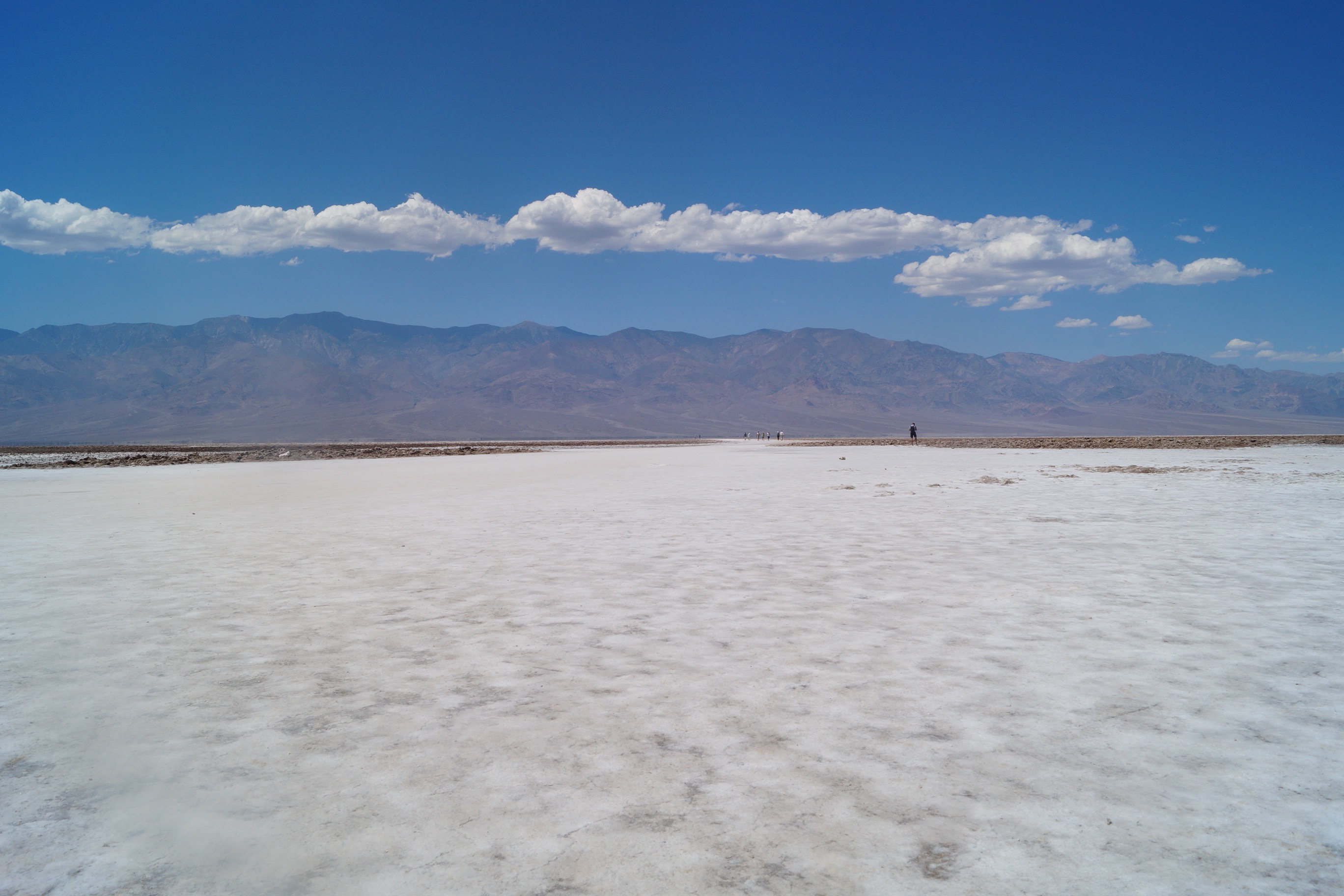 Die nächsten Kilometer schleiche ich nun weiter. Tatsächlich kommt auch wenige Minuten später ein Krankenwagen von hinten heran und fährt an uns vorbei. Ansonsten ist wenig los, wir gleiten so dahin. Irgendwann taucht nach einer kleinen Senke der Parkplatz von Badwater auf. Wir stellen das Auto ab, trinken noch etwas und starten den kleinen Ausflug auf die Salzpfanne. Jeder nimmt zusätzlich auch noch zwei Wasserflaschen mit.