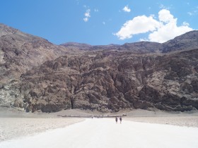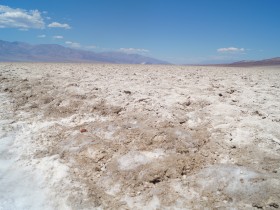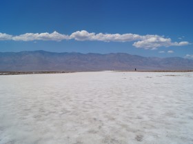 Die nächsten Kilometer schleiche ich nun weiter. Tatsächlich kommt auch wenige Minuten später ein Krankenwagen von hinten heran und fährt an uns vorbei. Ansonsten ist wenig los, wir gleiten so dahin. Irgendwann taucht nach einer kleinen Senke der Parkplatz von Badwater auf. Wir stellen das Auto ab, trinken noch etwas und starten den kleinen Ausflug auf die Salzpfanne. Jeder nimmt zusätzlich auch noch zwei Wasserflaschen mit.
