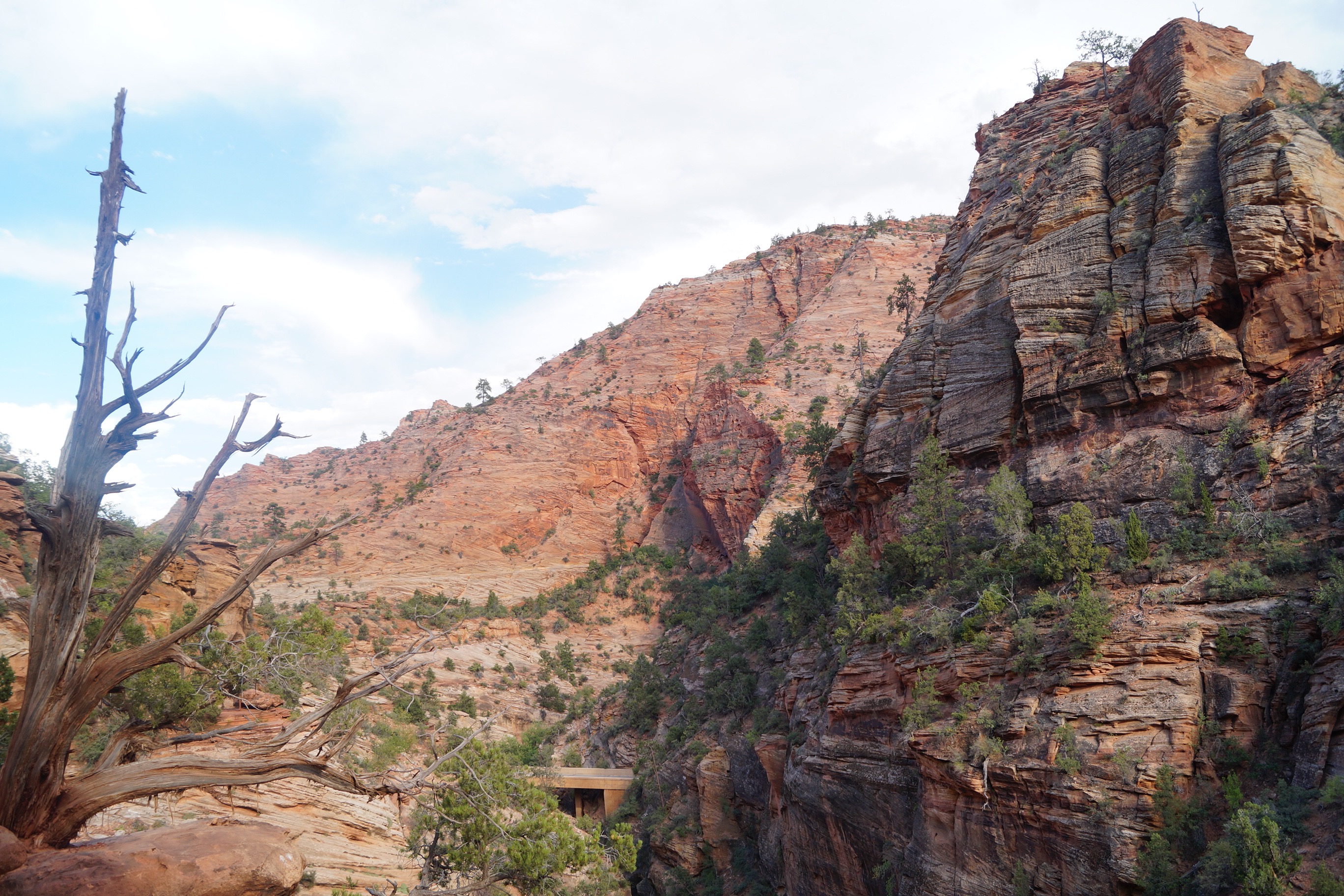 Nach kurzer Wartezeit geht es weiter durch den Tunnel und direkt nach Ende des Tunnels auf den rechts gelegenen Parkplatz. Wir stellen das Auto ab, überqueren die Straße und begeben uns auf den kurzen Canyon Overlook Trail. Der Trail ist eigentlich nur am Anfang recht steil, hier geht es auch über ein paar Treppenstufen nach oben. Ansonsten geht es danach eher eben dahin, insgesamt also eine nette Abwechslung zum fahren. Zwischendurch wandert man auch durch eine kleine Höhle, die zur Talseite hin offen ist. Wirklich sehr schön.