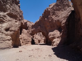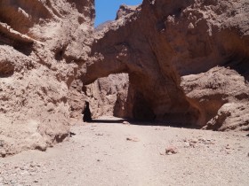 Wir fahren nun wieder in Richtung Furnace Creek, biegen aber bald rechts auf eine Dirt Road, die Natural Bridge Rd ab. Es geht für vielleicht 1 Kilometer leicht bergauf in Richtung der Berge. Das Stück ist einigermaßen gut fahrbar, wenn man nicht allzu flott fährt.