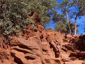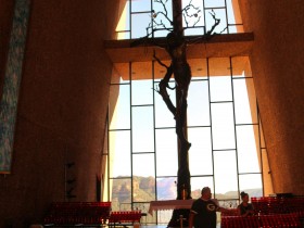Gegen 16 Uhr kommen wir in Sedona an und anstatt direkt zum Hotel zu fahren, machen wir noch einen Abstecher zu einer ganz besonderen Kirche, der Chapel of the Holy Cross. Hierbei handelt es sich um eine römisch-katholische Kirche mit besonderer Architektur, die auch 1957 von dem amerikanischen Institut für Architektur ausgezeichnet wurde. Die, zu den Öffnungszeiten jederzeit frei zugängliche Kirche, wurde mitten in die roten Felsen von Sedona gebaut um, verstärkt durch die spirituelle Ader der Gegend, näher bei Gott sein zu können.