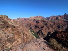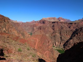 Hier zweigt der River Trail vom South Kaibab Trail ab. Hier würde man direkt zum Bright Angel Trail abkürzen, ohne den Colorado 2x zu überqueren. Das kommt natürlich nicht in Frage, denn wenn man schon so weit gekommen ist, dann will man natürlich näher an den Fluss ran und außerdem freue ich mich schon seit einer gefühlten Ewigkeit auf die eiskalte Limo an der Phantom Ranch.
