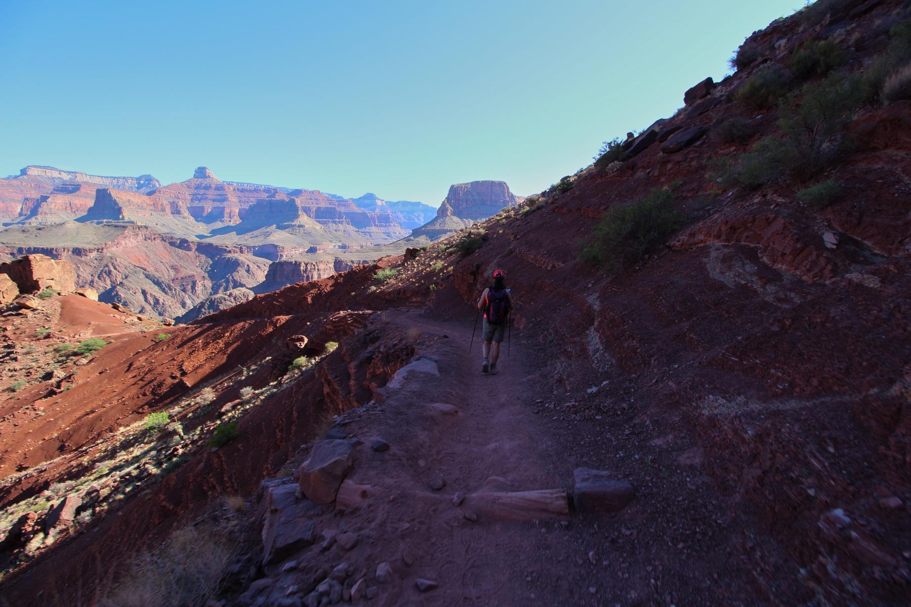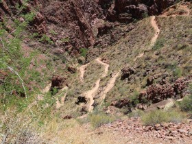 Einstufung Schwierigkeit: Strenuous! Es geht auf fast 12 km fast pausenlos bergab, teilweise ziemlich steil. Es gibt keine Wasserversorgung oder Schatten auf dem Trail. Die Temperaturen sind nicht zu unterschätzen, auch wenn es am Rim kühl ist. Die Temperatur steigt um 1°C pro 100 Höhenmetern abwärts, was eine Differenz von 14°C von Rim zu Phantom Ranch bei gleicher Uhrzeit ausmacht.