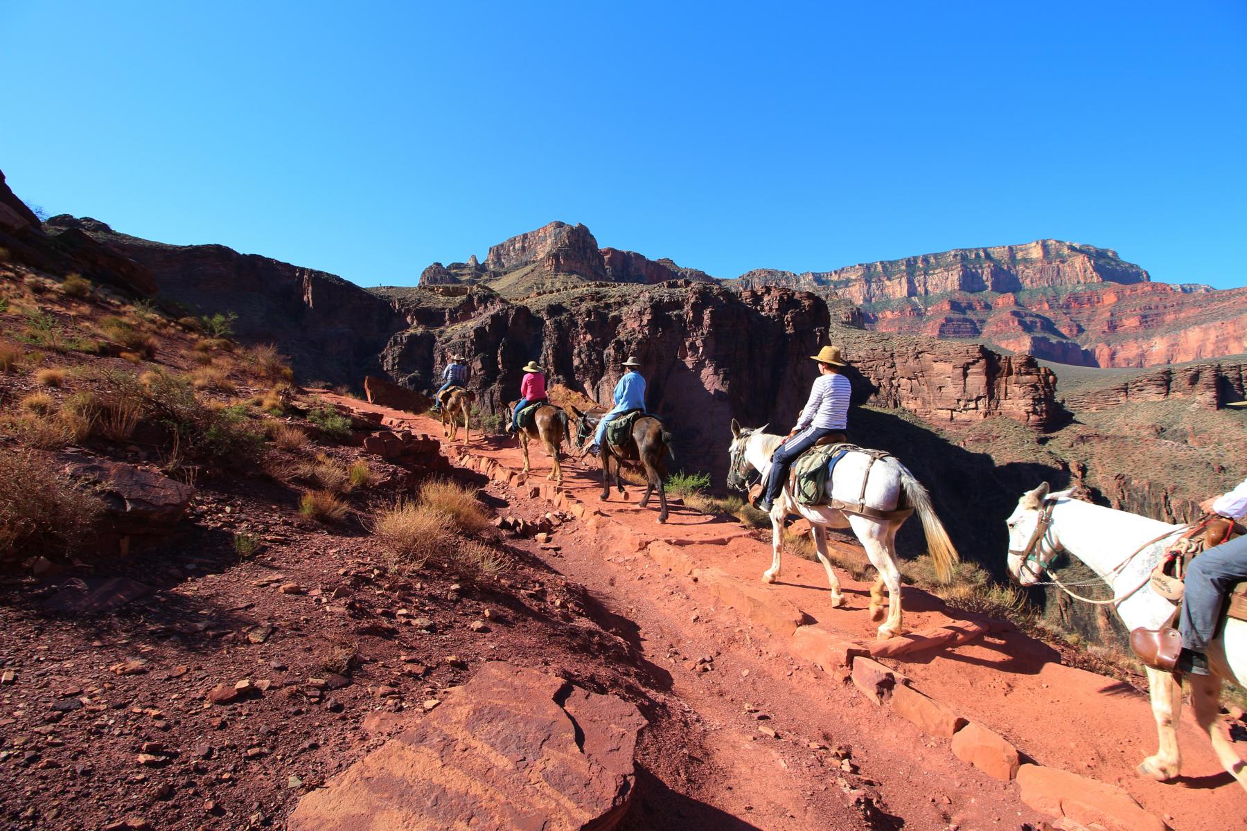 Schon sehen wir auch die 2. Gruppe Maultiere. Im Gegensatz zu denen vorhin, transportieren die hier keine Menschen, sondern tragen den Müll der Phantom Ranch und Postkarten zurück zum Rim. Der Reiter an der Spitze fragt uns noch sehr freundlich ob alles in Ordnung ist und ob wir die Wanderung genießen.