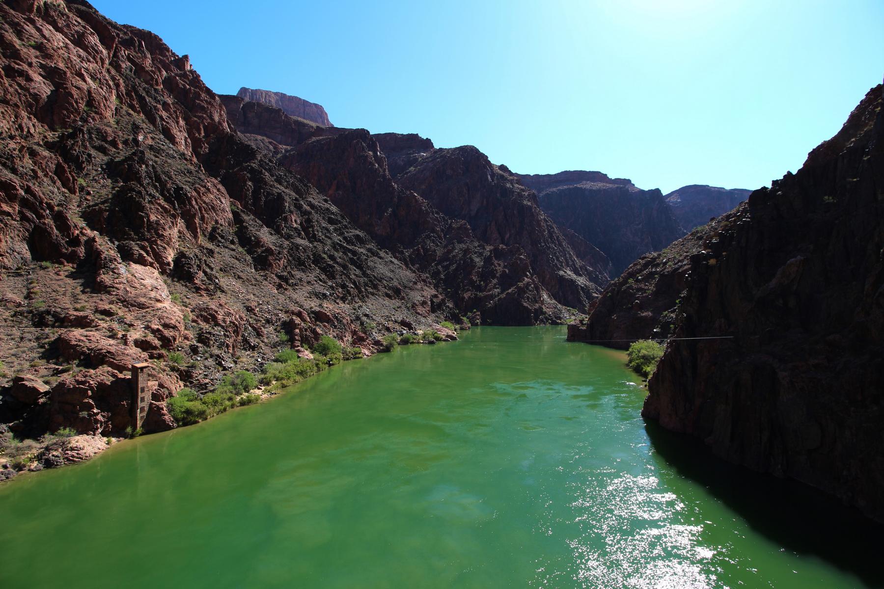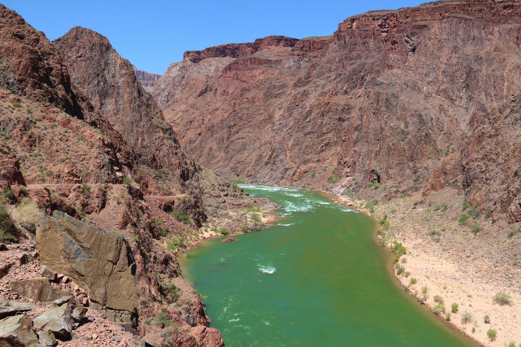 Beim folgenden Bild erkennt man gleich beide Brücken! Neben der Black Bridge gibt es nämlich wenige hundert Meter entfernt noch die Silver Bridge, über die wir später zurück müssen. Zwischen den beiden Brücken geht ein dicht bewachsener Canyon ab, dort befindet sich die Phantom Ranch und der Bright Angel Campground.