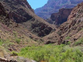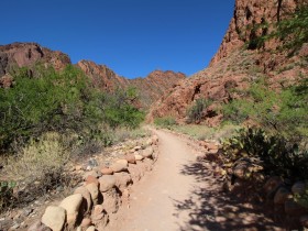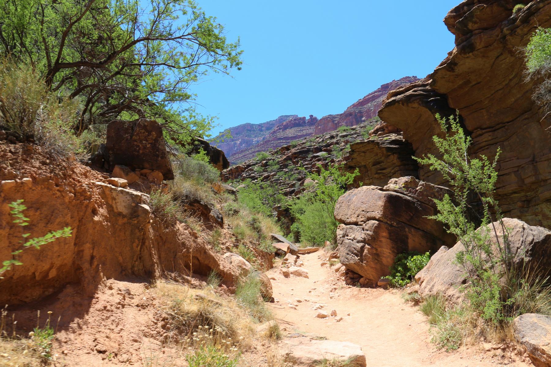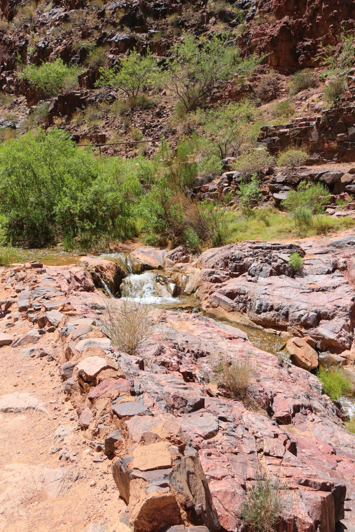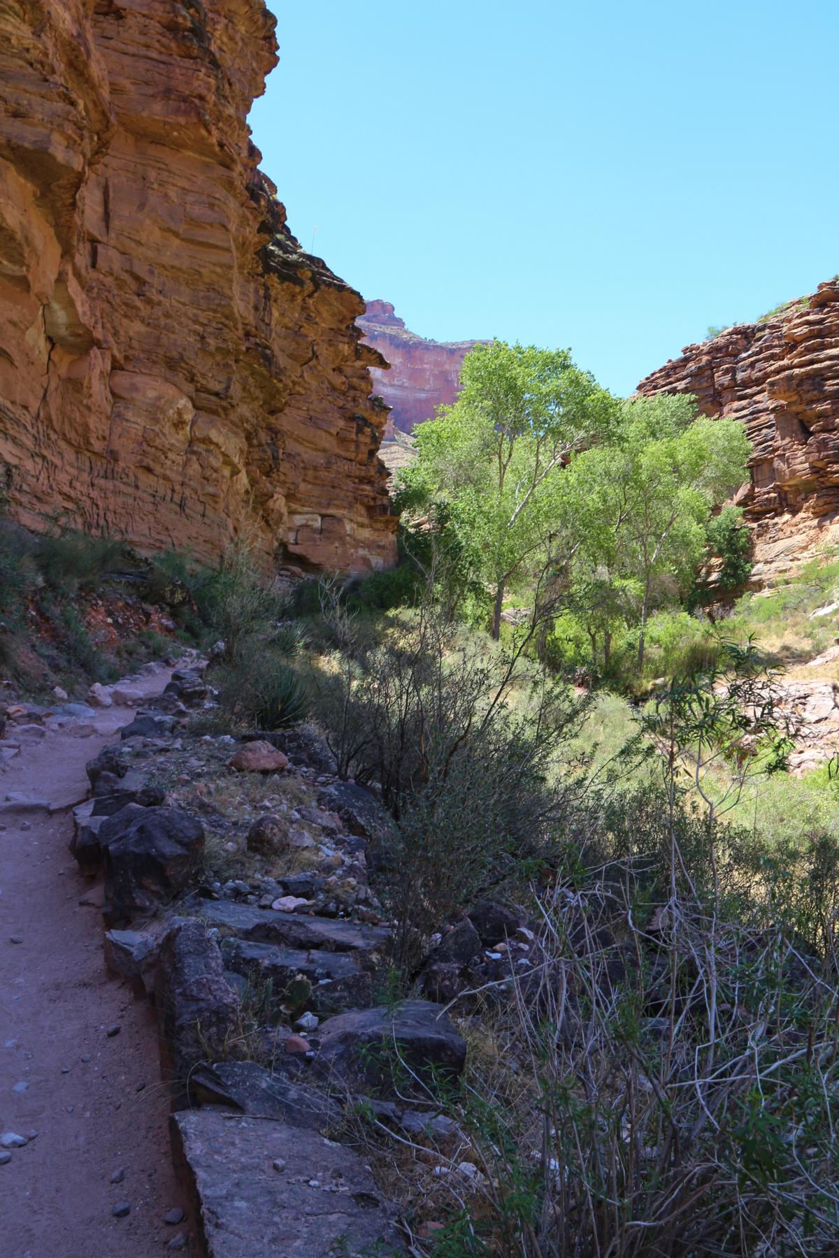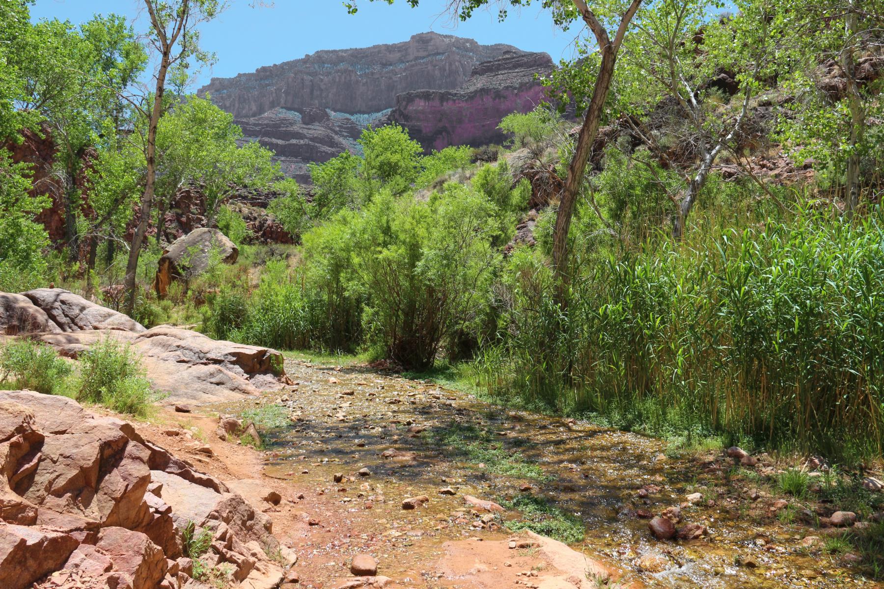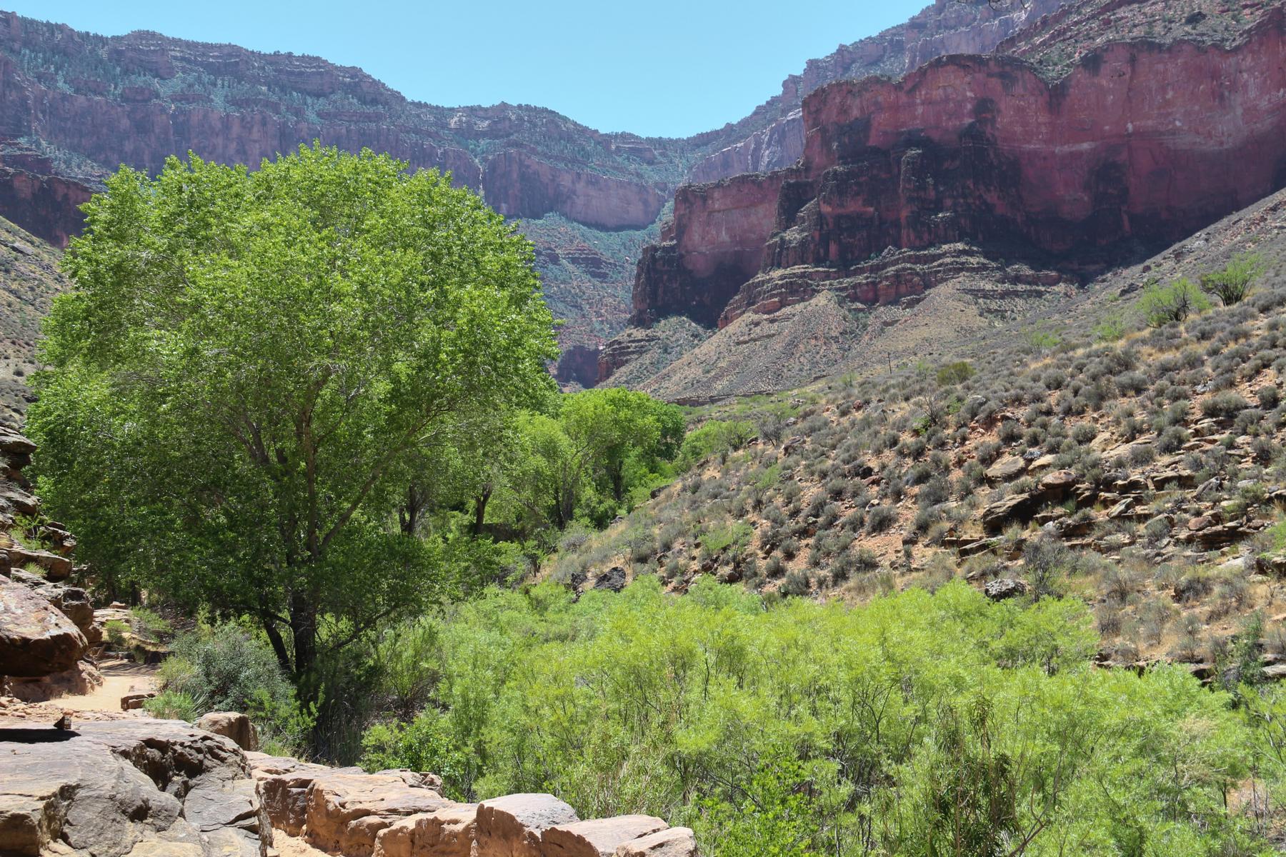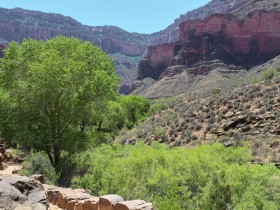 Das war es jetzt auch schon wieder mit Steigung, es wird immer grüner und wir folgen dem Verlauf des Baches. Es gibt überall zwischendurch ein wenig Schatten und es ist wie im Paradies. Auf dem Bright Angel Trail begegnet uns auch so gut wie niemand mehr.