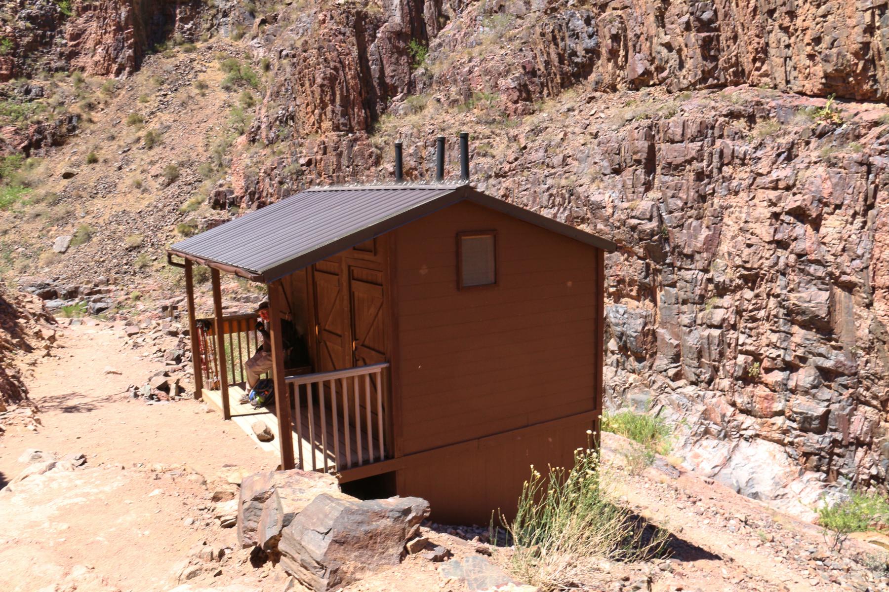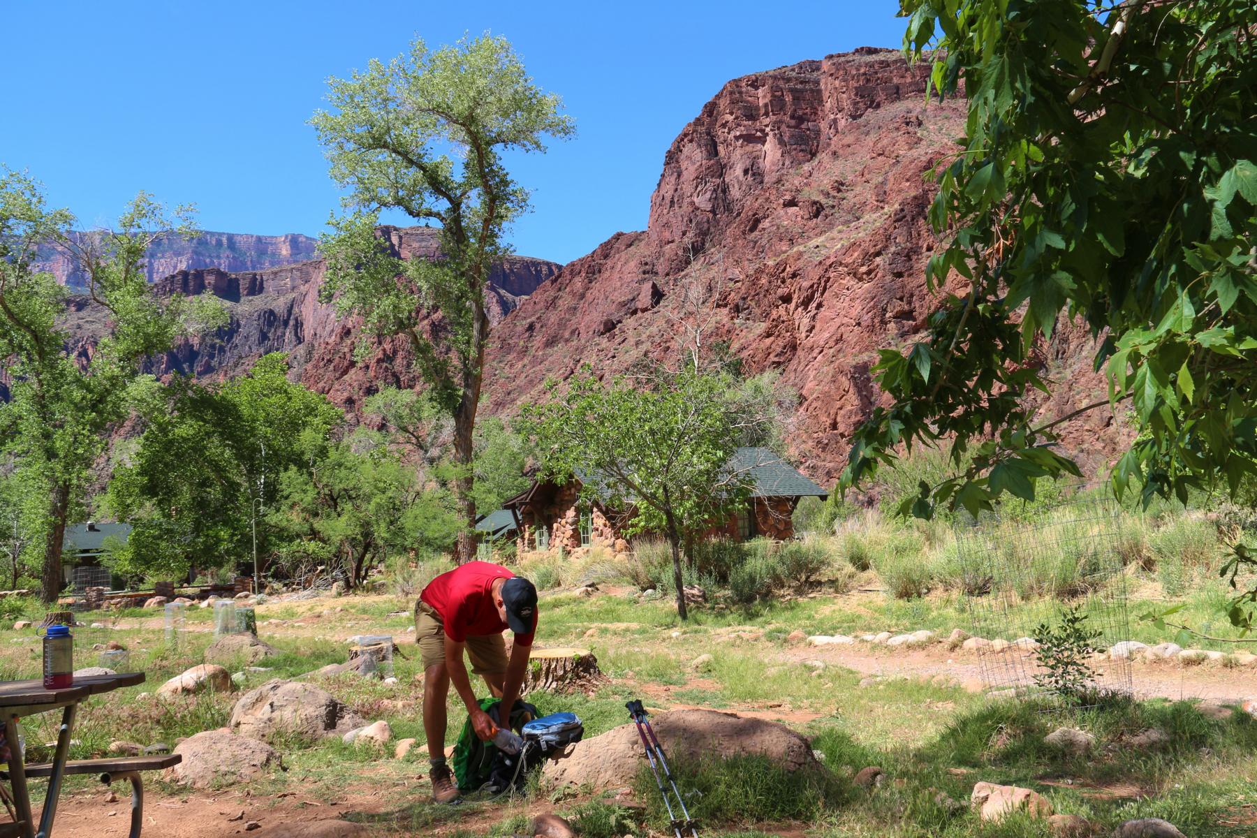 Und dann... ENDLICH taucht das Gebäude vor unserer Nase auf und die meisten Hiker haben sich bereits hier versammelt. Hier herrscht eine geniale Atmosphäre, fremde Menschen klatschen sich zufrieden ab, Stolz liegt in der Luft, alle sind einfach glücklich angekommen zu sein und bereiten sich auf einen extrem entspannten Nachmittag unter dem Schatten der Bäume am Bright Angel Creek vor. Alle - außer wir. Auch wir sind natürlich froh und stolz angekommen zu sein, aber wir haben noch den langen Aufstieg im Hinterkopf, den wir gleich antreten müssen. In dem Moment bin ich doch etwas traurig, nicht auch einfach mit allen anderen hier unten bleiben zu können. Andererseits... Es ist nicht einmal 10 Uhr morgens. Was soll ich jetzt bis morgen früh hier?! Klar ist es toll hier und es lässt sich sicher einige Zeit aushalten. Aber SO lange?