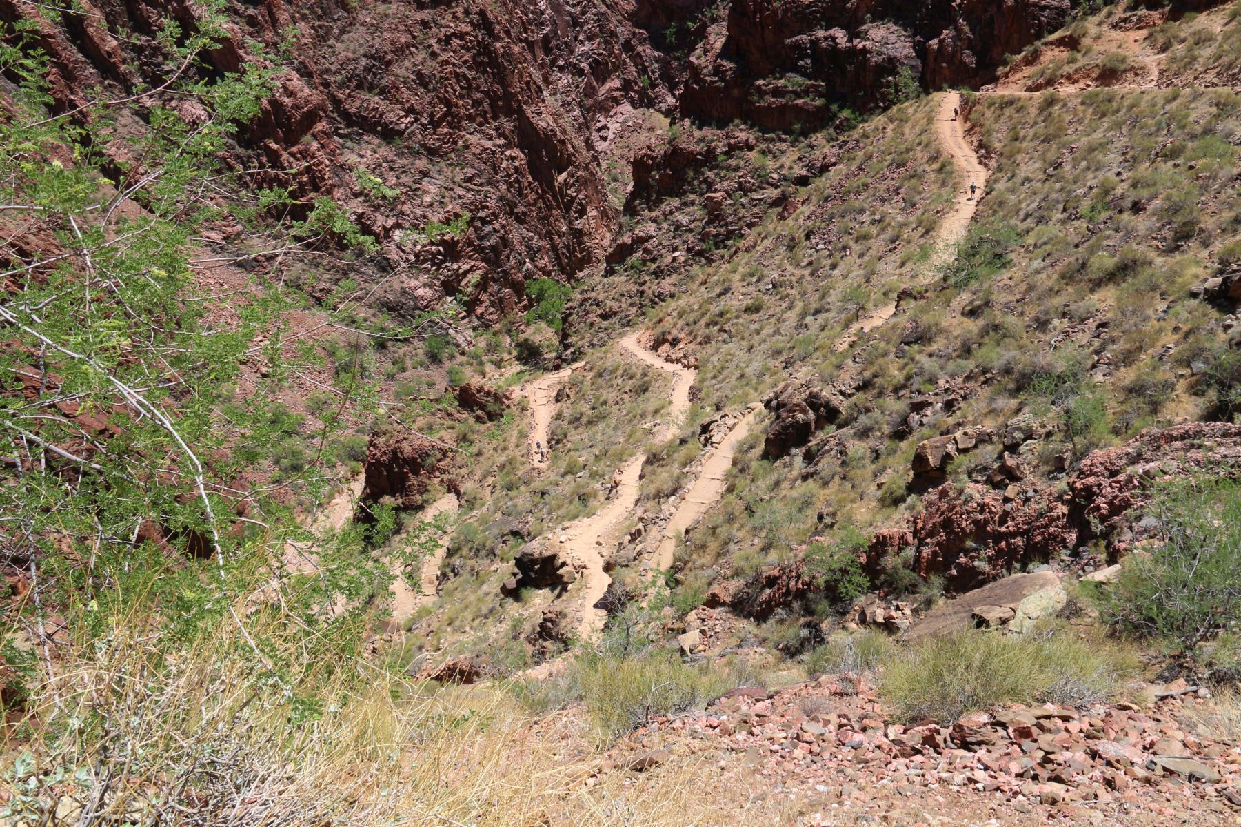 Nach der Begegnung beginnen die berüchtigten Devils Switchbacks des Bright Angel Trails: Eine ganze Reihe von fiesen Serpentinen! Normalerweise steigt man hier so früh auf, das sie noch komplett im Schatten liegen, wir müssen es in der Mittagssonne mit ihnen aufnehmen.