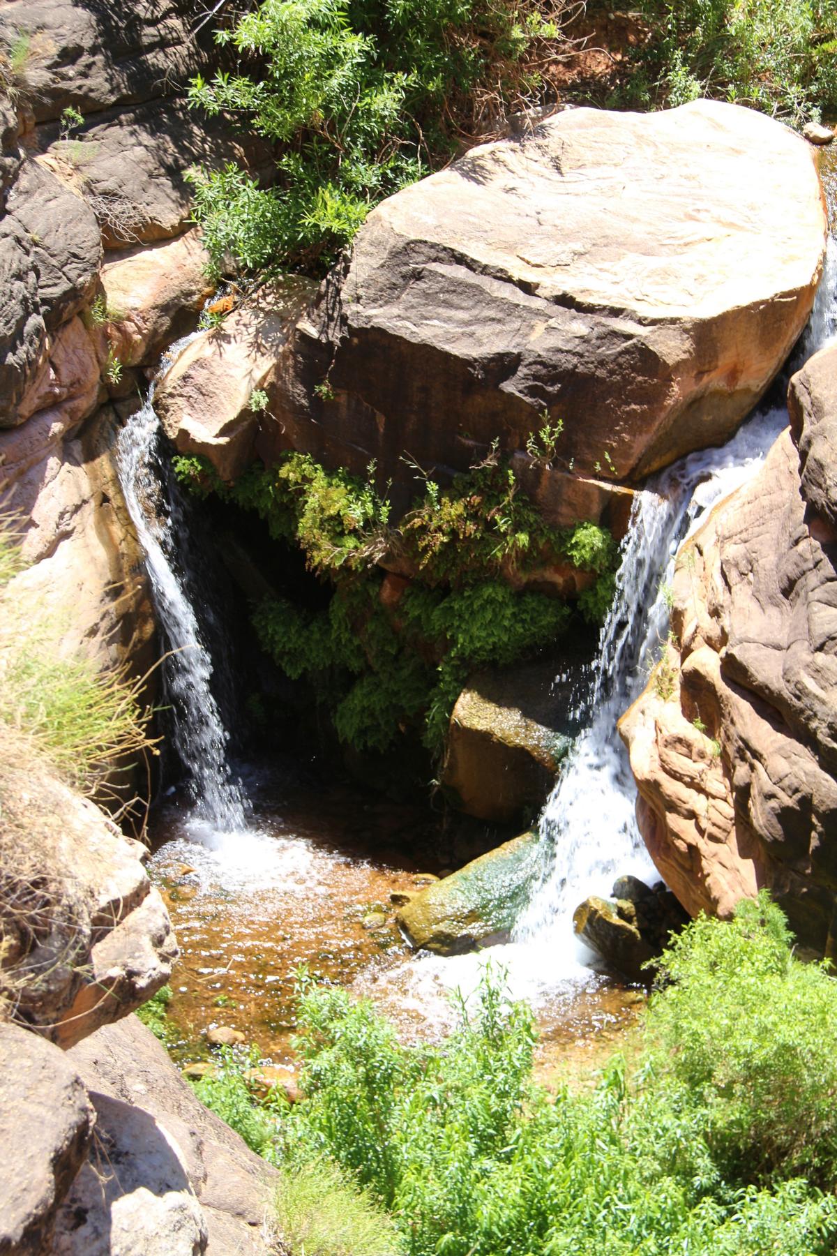 Sogar herrliche Wasserfälle gibt es hier gleich neben dem Weg, Weitsicht ist dafür praktisch nicht vorhanden. Ich bin richtig begeistert und hätte nie gedacht, das die beiden Trails so grundverschieden sind, wo sie doch beide in den Grand Canyon führen und nicht weit voneinander entfernt sind.