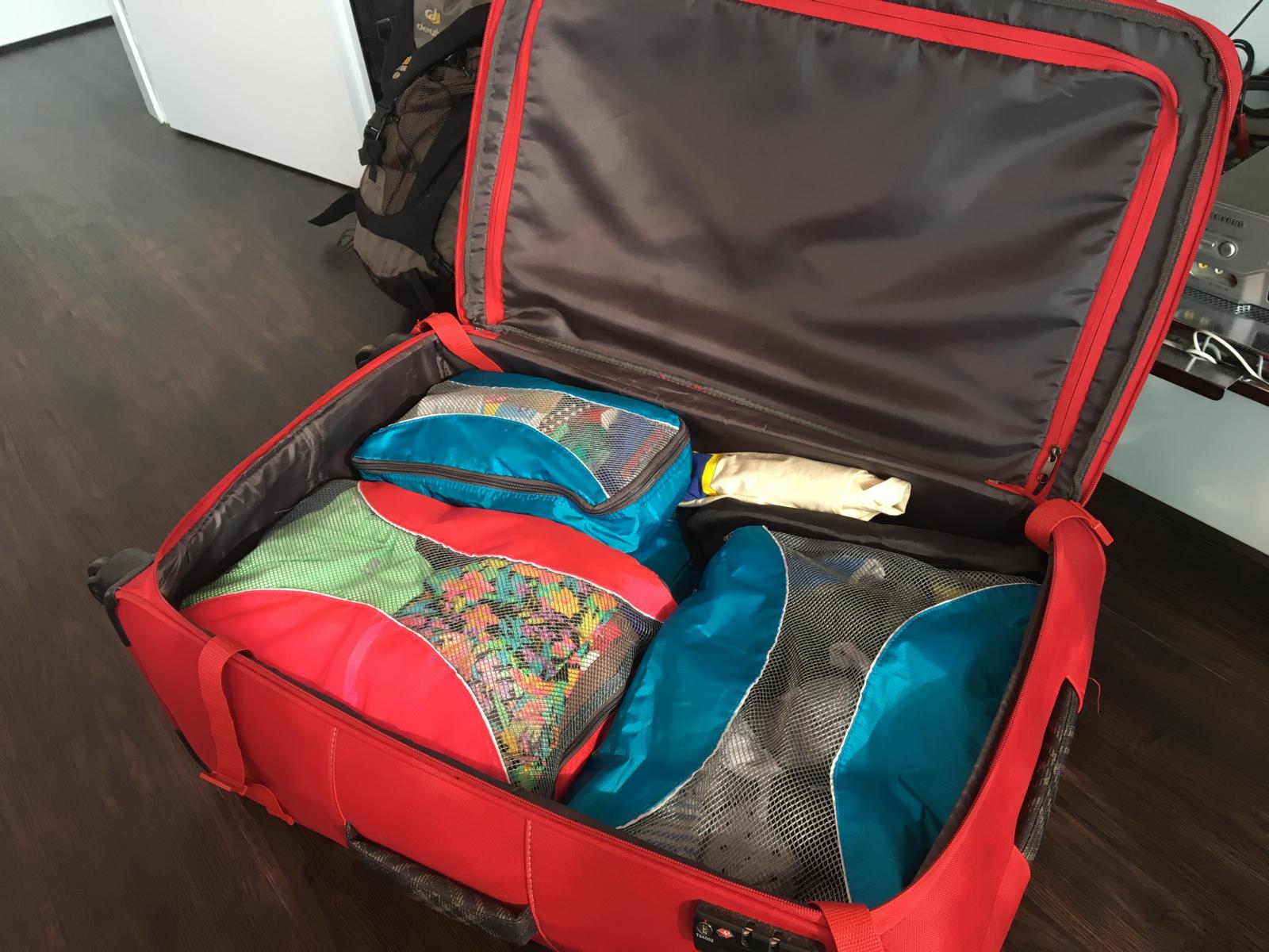 Wie unschwer zu erkennen ist, habe ich mich auch selbstverständlich für meine geliebten Packwürfel entschieden. Es sorgt einfach für eine tolle Ordnung im Koffer und das bleibt auch während der Rundreise so, schon im Dezember war ich absolut überzeugt von den kleinen Helfern. Ich könnte jetzt auch 30 Paar Socken in die Ritzen stopfen, allerdings würde ich das letzte Paar am letzten Tag nicht mehr finden – schon gar nicht in der ursprünglichen Ritze. Das hat mich vorher regelmäßig wahnsinnig gemacht und hat dadurch jetzt ein Ende. Ein Würfel gehört nicht mir – sieht man ja schon an der Farbe. Einen habe ich mit meiner Mutter ausgetauscht und beinhaltet einmal „alles“, also ein paar Unterhosen, Socken, Wechsel T-shirt und eine kurze Hose. Quasi das Notfall Paket, wenn der eigene Koffer nicht direkt mit ankommt. Die Wanderschuhe werde ich auf dem Flug tragen, die können also nicht wegkommen. Gut so, die Teile sind vermutlich das wichtigste Kleidungsstück der folgenden 4,5 Wochen.