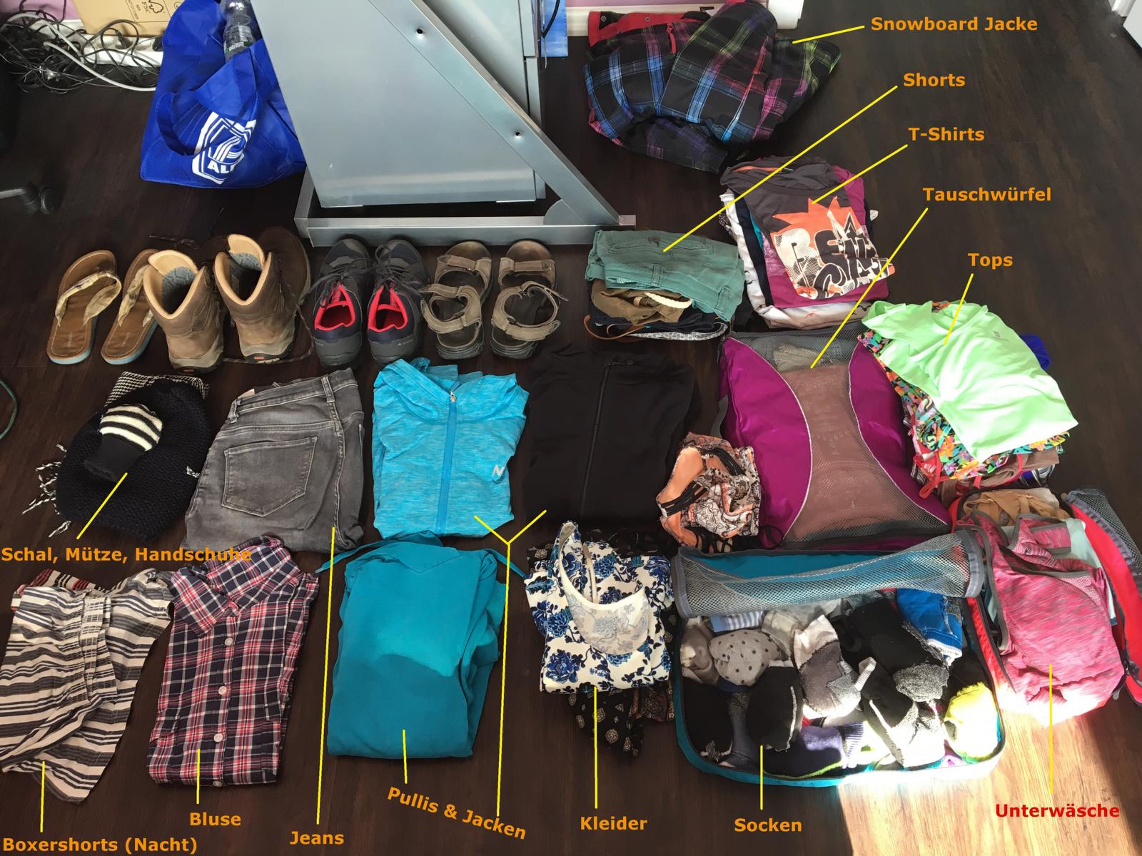 Fangen wir erst einmal mit den Klamotten an: Wie ihr seht, habe ich mich dafür entschieden, für die kompletten 30 Tage Kleidung einzupacken und NICHT zwischendurch waschen zu müssen. Klar wäre das beim Packen einfacher, aber irgendwie habe ich da im Urlaub keine Lust zu. Das Wetter kann so ziemlich alles bereithalten, daher ist von Bikini, Tops und Shorts bis zu Jeans, Fleece Pulli, Schal, Mütze, Handschuhe und Jacke alles dabei.
