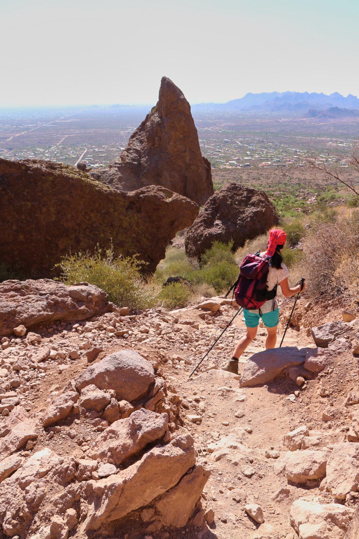 Könnt ihr den Flatiron erkennen? Er erhebt sich wie ein gigantisches Bügeleisen aus den Superstitions. Es handelt sich um die Spitze, die direkt oberhalb des großen Saguaros zu sehen ist! Um Gottes Willen... Das wird ein Gewaltmarsch bei der Hitze.
