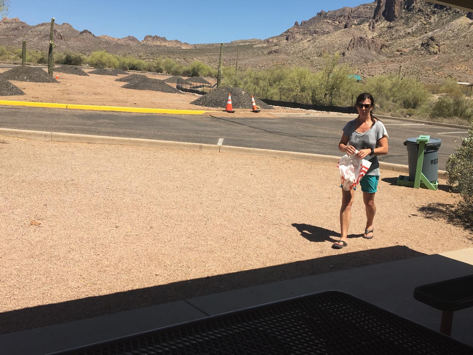 Wir bezahlen bei der Einfahrt unsere 7$ Eintritt und fahren bis zum Siphon Draw Trailhead, wo es auch zahlreiche überdachte Picknick Möglichkeiten gibt. Wie die Tage zuvor sind wir auch hier wieder ziemlich alleine, aber es wundert mich nicht groß. Die Sonne brennt erbarmungslos vom Himmel und die Temperaturen liegen im hohen 30er Bereich. Wieder einmal eine hervorragende Tageszeit und eine hervorragende Temperatur um eine schwere Wanderung auf sich zu nehmen.