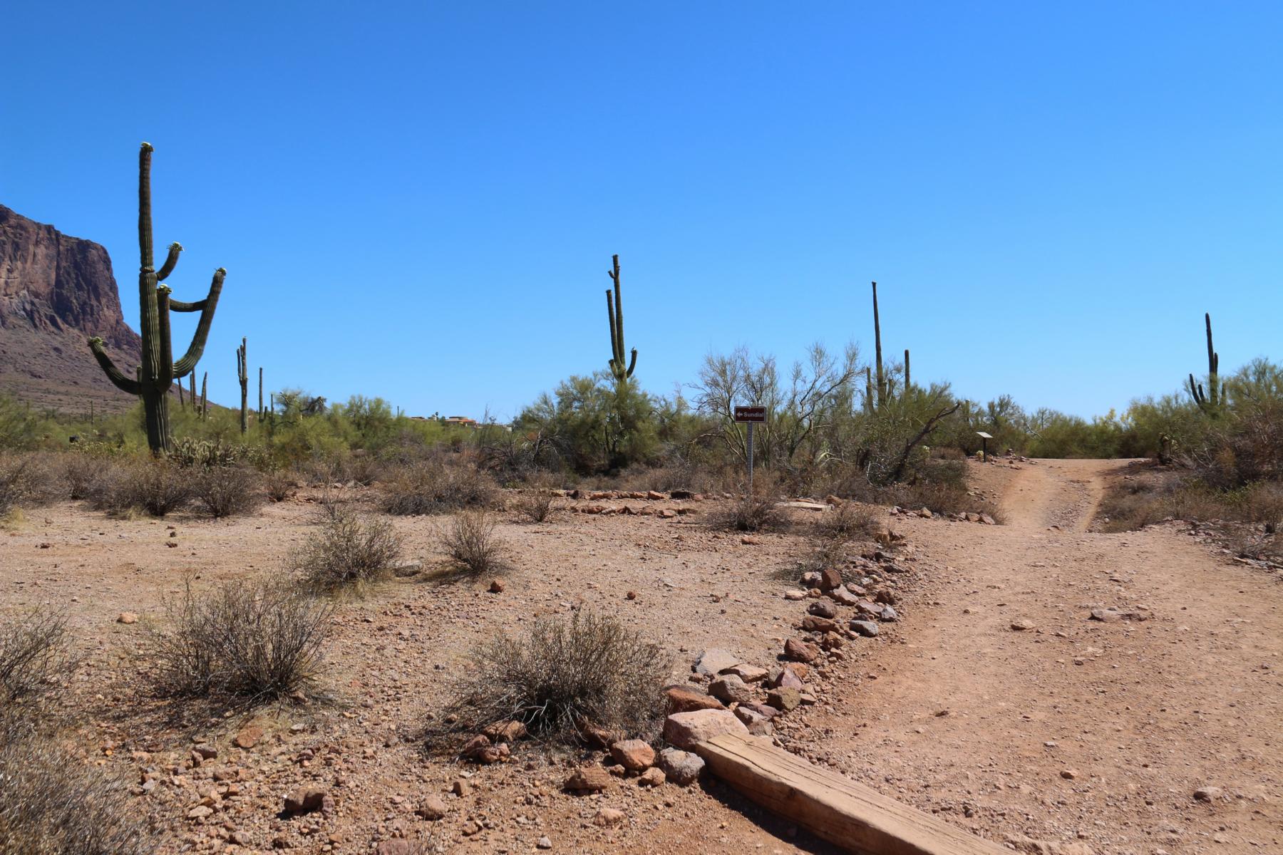 Um 14:40 Uhr starten wir schließlich mit dem Siphon Draw Trail zum Flatiron. Flatiron?! Ist das nicht dieses komische, bügeleisenförmige Gebäude in NYC? Ja... Auch. Der Flatiron ist aber auch dieser komische, bügeleisenförmige Berg in den Superstition Mountains, vor denen wir hier gerade stehen.