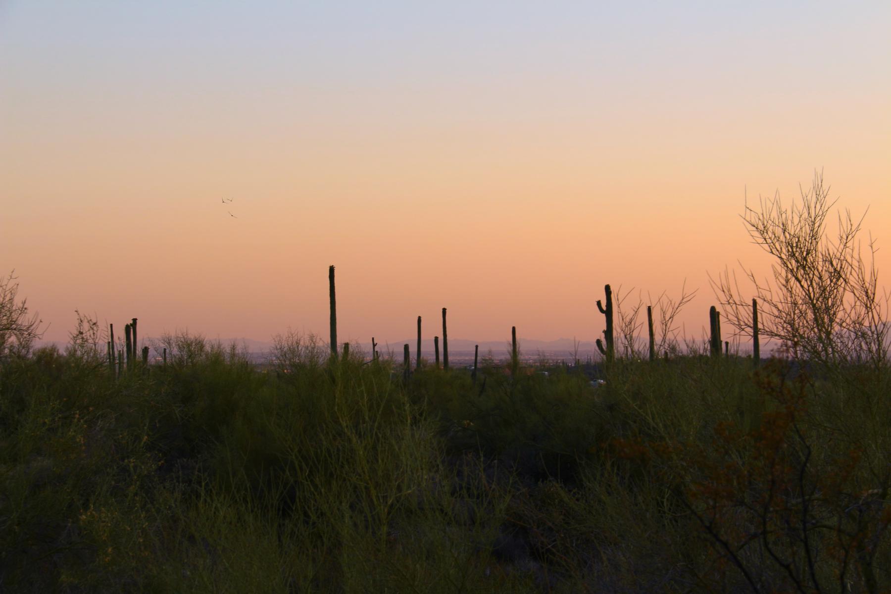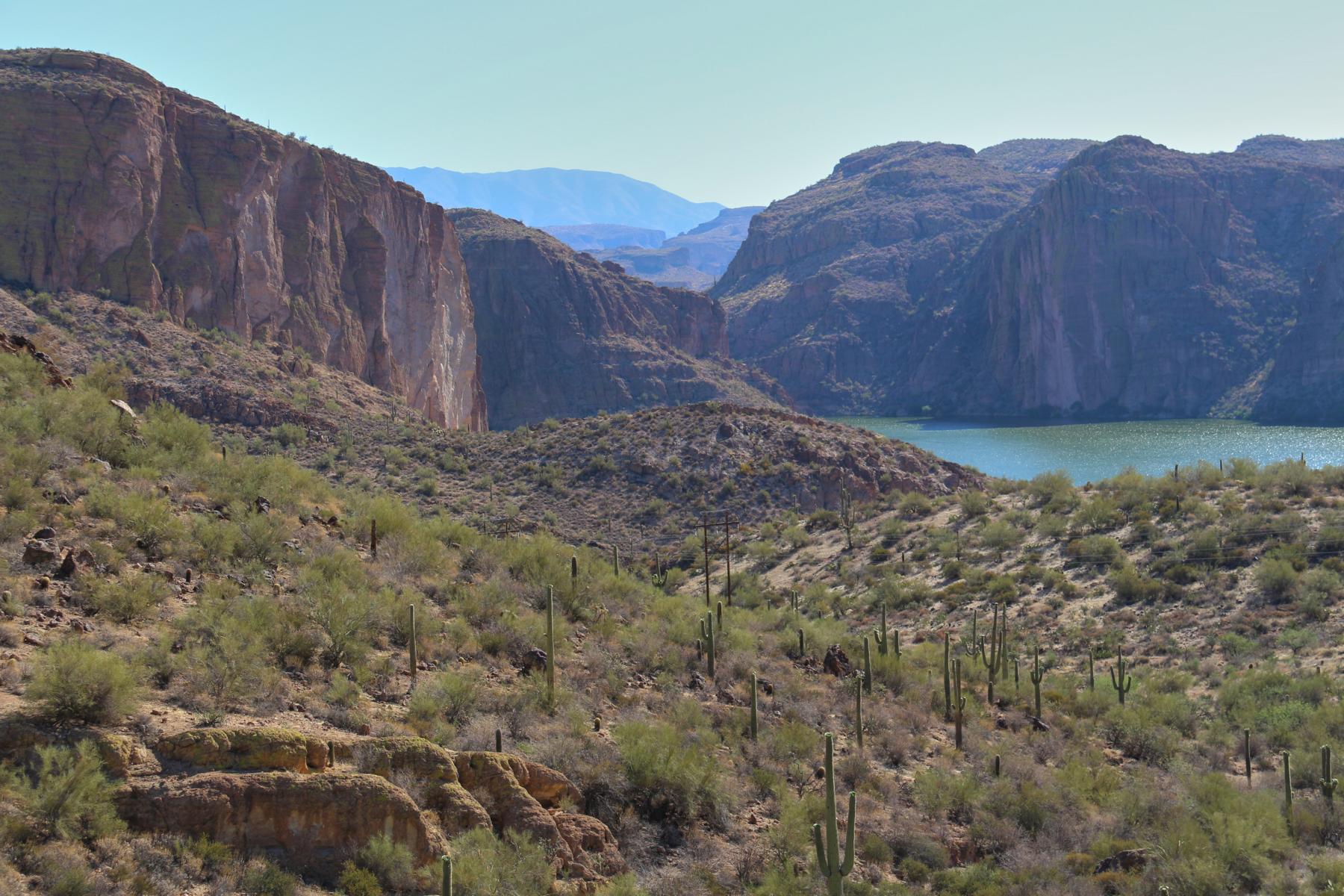Könnt ihr den Flatiron erkennen? Er erhebt sich wie ein gigantisches Bügeleisen aus den Superstitions. Es handelt sich um die Spitze, die direkt oberhalb des großen Saguaros zu sehen ist! Um Gottes Willen... Das wird ein Gewaltmarsch bei der Hitze.