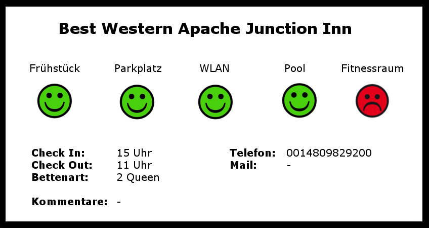 Um 14 Uhr kommen wir im Best Western Apache Junction an und können bereits einchecken, das habe ich nicht erwartet, aber umso besser. Leider dauert das sehr lange, da die Rezeptionistin noch angelernt wird und irgendwie meinen Namen auf der Bestätigung nicht finden kann. Sobald ich merke wo es hakt, drücke ich ihr meinen Pass in die Hand, aber da sind schon ein paar Minuten vergangen. Wir bringen unsere Koffer auf's Zimmer, die Tüte mit dem Essen, das Campingbesteck und die Kühlbox dürfen allerdings im Auto bleiben.