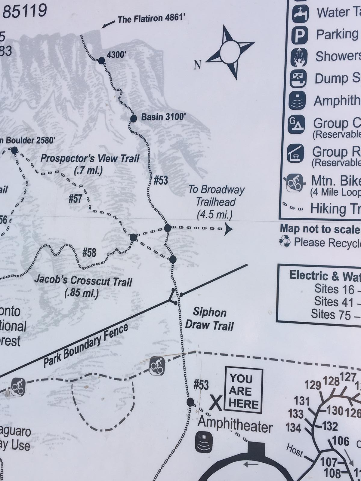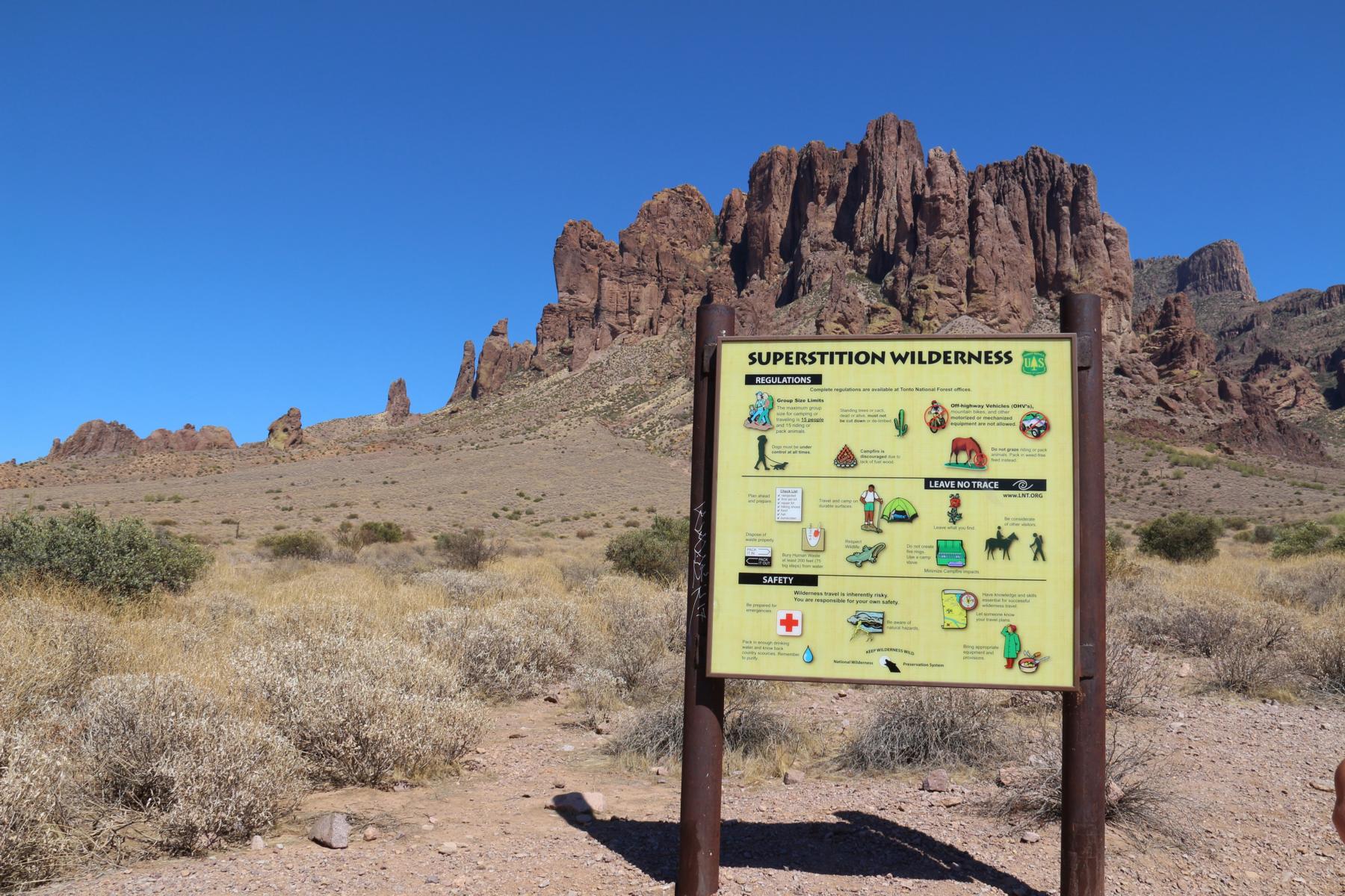 Um 14:40 Uhr starten wir schließlich mit dem Siphon Draw Trail zum Flatiron. Flatiron?! Ist das nicht dieses komische, bügeleisenförmige Gebäude in NYC? Ja... Auch. Der Flatiron ist aber auch dieser komische, bügeleisenförmige Berg in den Superstition Mountains, vor denen wir hier gerade stehen.