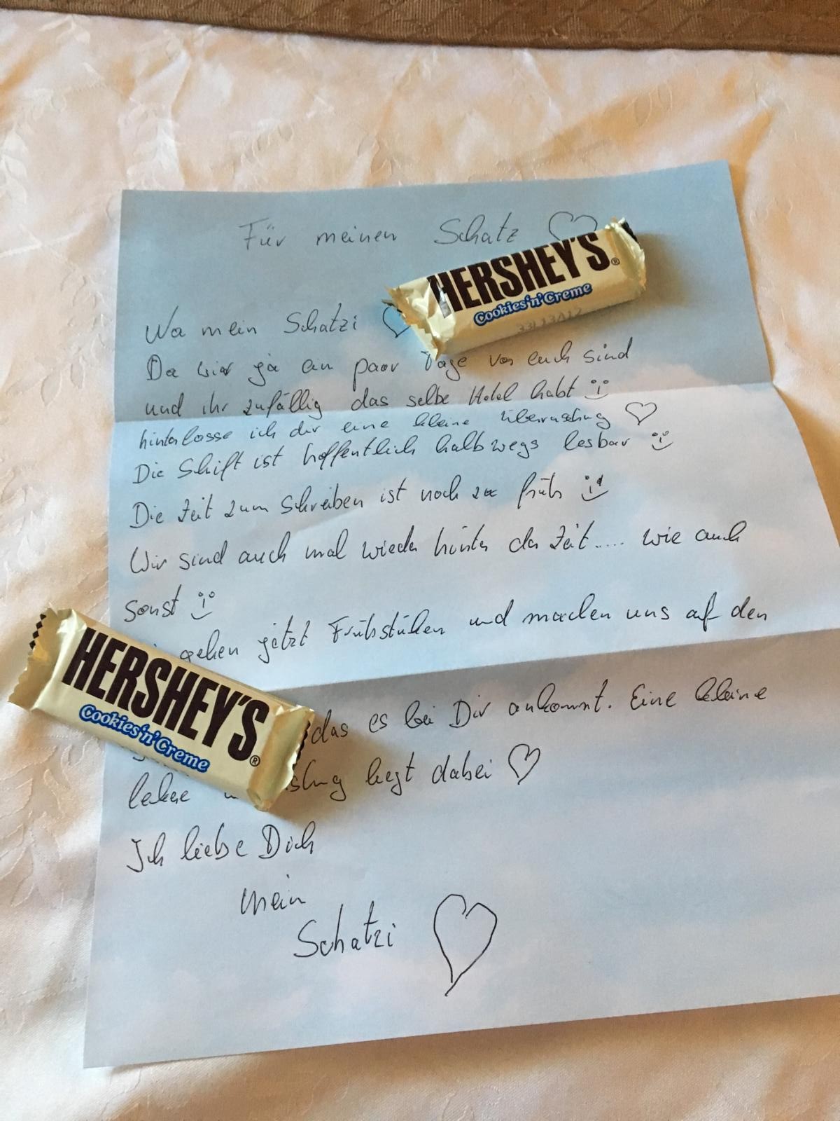 Aber doch, es ist tatsächlich ein Brief von Dominik, den er an der Rezeption für mich abgegeben hat, als er vor ein paar Tagen hier übernachtet hat. Damit hätte ich im Leben nicht gerechnet und freue mich so richtig darüber. Meine Lieblingsschokolade hat er auch noch dabei gepackt, ich bin richtig fassungslos, ein Brief wäre das letzte, womit ich bei ihm gerechnet hätte und dann auch noch HANDGESCHRIEBEN :D Ich habe den besten Freund der Welt! (Ich habe natürlich gefragt ob ich das Bild posten darf, steht ja nichts ungewöhnlich persönliches drin)