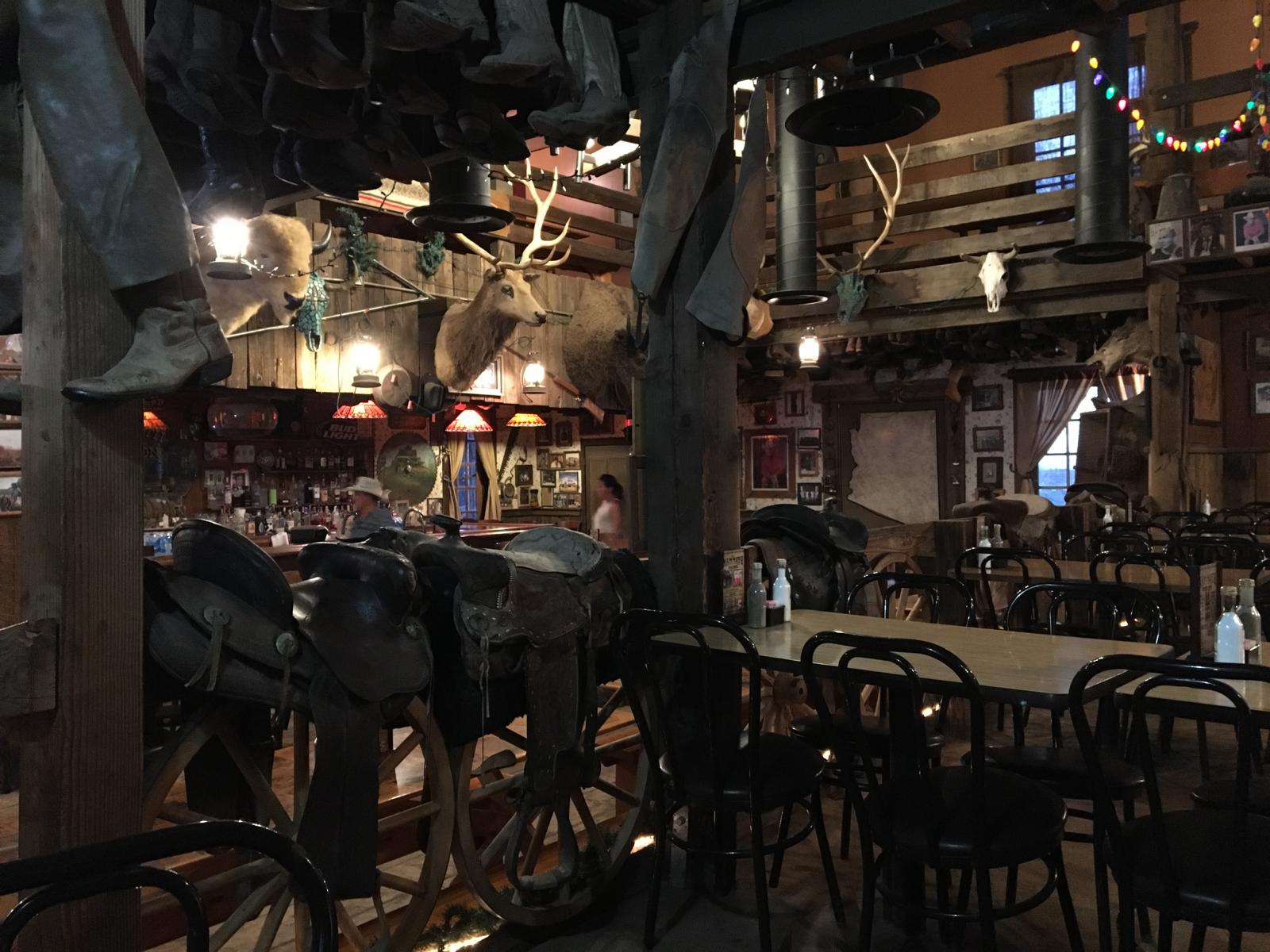 Ich gehe zurück zum Auto und wir beschließen noch einmal die Restrooms im Saloon aufzusuchen, bevor wir irgendwann wieder fahren dürfen. Hier drin ist es echt verdammt cool, besonders die Westernsättel als Barhocker gefallen mir sehr.