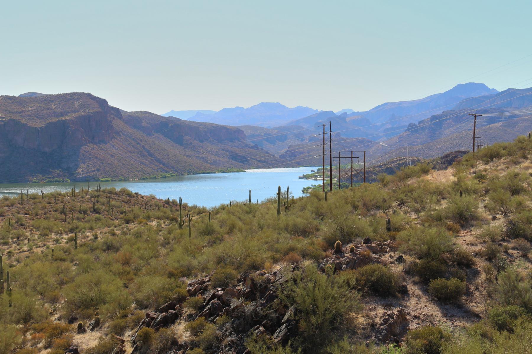 Der Apache Trail ist auf dem ersten Teil noch asphaltiert und führt die Berge hoch und runter. Die Gegend ist wunderschön, es gibt Hügel, Seen, Saguaros und... Strommasten. Davon habe ich gelesen und die sind wirklich nicht besonders passend in der Gegend, aber man kann es nicht ändern.
